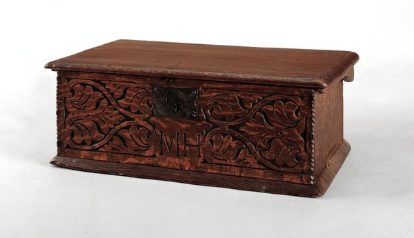 Curator: I'm struck by how tactile this box appears. The deeply carved ornamentation creates such visual texture. Editor: Indeed. This is a Moravian box still bank, dating to about 1756. It resides here at the Minneapolis Institute of Art, crafted from wood and showcasing both carving and relief work. What resonates with you? Curator: Well, the first thing that grabs my attention is the juxtaposition of the refined carving with the object's very practical function as a bank. It suggests a societal value placed on thrift and craftsmanship, perhaps intertwined with religious convictions within the Moravian community. Editor: I agree. Formally, the rounded shape against the sharp geometric patterns creates tension. Notice how the circular flower motif at each end contrasts the linear bands along the sides. It directs the eye in a pleasing circular path. Curator: Right, the visual balance suggests that even mundane objects like a still bank, were meant to embody a certain elevated ideal within the community. The care with which the craftsman decorated it elevates it beyond mere utility. Editor: There is a narrative here about community and purpose. I'd be fascinated to understand if particular patterns or designs were employed symbolically and how the introduction of banking would influence daily commerce in that time. Curator: Precisely. And what did owning such an intricately adorned bank represent for the owner? Was it a symbol of prosperity, religious devotion, or something else entirely? We see the object itself as an expression of a collective morality in 18th century Europe. Editor: Examining art through its materials and shapes reminds us that the maker chose how best to deliver beauty and meaning. Curator: I've truly appreciated focusing not just on aesthetics, but the ways even the most practical items weave into a complex history of belief.