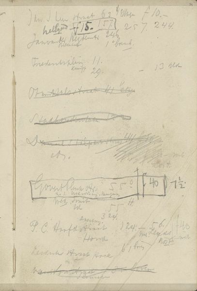 Curator: Welcome. We're looking at a drawing titled "Ontwerp voor een ornament met een liervogel," or "Design for an Ornament with a Lyrebird," dating from around 1906, by Carel Adolph Lion Cachet. It’s currently held in the Rijksmuseum collection. Editor: It has the feel of a casual sketchbook page—a glimpse into the artist's process. Scribbled calculations share space with the elegant curves of a lyrebird. The composition is very loose and informal. Curator: Indeed. Cachet was deeply engaged in the Dutch Arts and Crafts movement, Nieuwe Kunst. This drawing offers insight into the design principles favored at the time. The use of the lyrebird as a motif, combined with stylized lines, epitomizes the Art Nouveau aesthetic. Editor: Precisely, but is there any deeper cultural relevance? The almost hidden numbers and calculations... What story do these elements tell? Curator: Those numerical notations reveal Cachet's engagement in design costing, production planning and the material considerations shaping artistic ideas and creative possibility at the time. This points towards an economy influencing both his art and that of the wider society. Editor: The stark contrast between the rigid accounting and the fluid depiction of the bird is striking. This hints at the tension present in early twentieth century design circles as people attempted integrating traditional artisan work with then-burgeoning mass industrial production. Curator: Good point. Moreover, we must not reduce its symbolic weight simply to style—the motif also points toward larger sociopolitical themes. Consider Cachet’s South African heritage, this element lends a richness beyond aesthetics when looking from our current cultural historical vantage point. Editor: Yes, so this work moves past formalism to embody complex socio-cultural issues that were present in Cachet's art. Curator: Precisely. It beautifully illustrates how the language of forms intersects and converses with economic considerations within a singular artistic vision. Editor: Well, looking at it this way certainly shifts how one views it. Thanks!