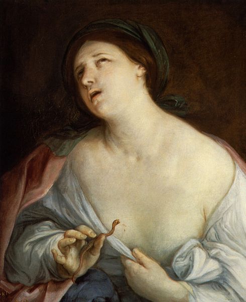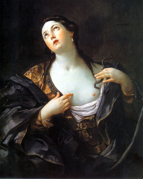 Editor: This is Guido Reni's "Lucretia," painted in 1626. It's an oil painting, and it strikes me as intensely melancholic. She's beautiful, but the presence of the dagger makes it unsettling. What’s your interpretation? Curator: Well, look at the time. 1626 was ripe with Counter-Reformation ideals. Reni's “Lucretia” isn’t just a pretty face; it’s a powerful, if troubling, statement on female virtue, public honor, and ultimately, male anxieties projected onto the female form. What purpose does her apparent nudity serve, in your opinion? Editor: It feels like vulnerability. It almost makes her a victim, even though she's about to take control. Is that the common interpretation? Curator: It's certainly *a* reading. Remember, the story of Lucretia—a woman who killed herself after being raped—was often used as a cautionary tale. Her suicide became a potent symbol of resistance, particularly within a patriarchal framework where female virtue was so closely tied to social order. Artists were commissioned to represent her act, embedding social mores in artistic practice and solidifying the painting’s function as a didactic, political tool. But is it *her* power being represented? Editor: That's a very interesting question. It challenges my initial sense of her agency in the artwork. Curator: Exactly. Consider who commissioned the painting, and what statement they wanted to make. How do you think that plays into our understanding of the work? Editor: This has definitely shifted my perspective! It's not just about Lucretia as an individual, but how she’s been used as a symbol within a specific historical context. Curator: Precisely! We started with an immediate impression, and then layered in the social and historical contexts. These historical narratives add complexity to our initial readings, revealing some hard truths about image construction.