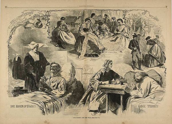 Editor: This is a fascinating image, "New York Charities - St. Barnabas House, 304 Mulberry Street," by an anonymous artist. I am struck by the division of space, the top area feels lighter and more hopeful than the bottom. How do you interpret this composition? Curator: Observe how the artist employs vertical and horizontal divisions to construct meaning. The upper register, with its framed doorway and inscription, offers a sense of promise, while the lower depicts a more grounded, communal setting. The stark contrast in tonal values and the strategic placement of figures guide our reading. Editor: So you’re suggesting that the structure itself is key to understanding the artwork's message? Curator: Precisely. The composition, along with the interplay of light and shadow, directs our gaze and underscores the thematic dichotomy. Consider how the artist manipulates form to convey a narrative of hope and community. Editor: That's a helpful way to consider the piece; I was missing that. Thanks! Curator: It is in understanding the language of form that we truly begin to decode an image such as this.