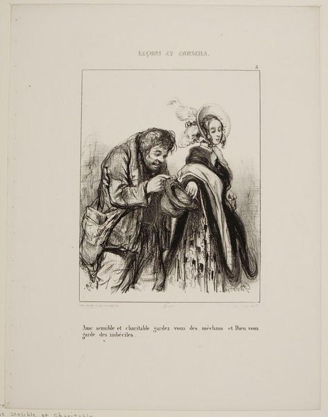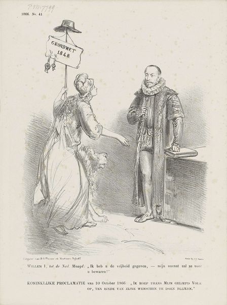 This political cartoon, made in 1864 by Johan Michaël Schmidt Crans, is printed on paper, likely using a technique like lithography or etching, which allowed for mass production and distribution. The stark black lines create a scene loaded with symbolism. We see figures weighed down, both literally and figuratively, by historical burdens. The artist uses the qualities of the print medium – its ability to render sharp detail and contrasting tones – to emphasize the weight of tradition and political maneuvering. The texture of the paper itself adds a tactile dimension, reminding us of the physical act of printing and distribution. Prints like these were powerful tools for shaping public opinion. The labor involved in their creation – from the artist's design to the printer's execution – speaks to the intense political debates of the time. It’s a reminder that art, even in reproducible form, is deeply intertwined with the social and political context in which it's made and consumed, blurring the lines between art, craft, and political action.