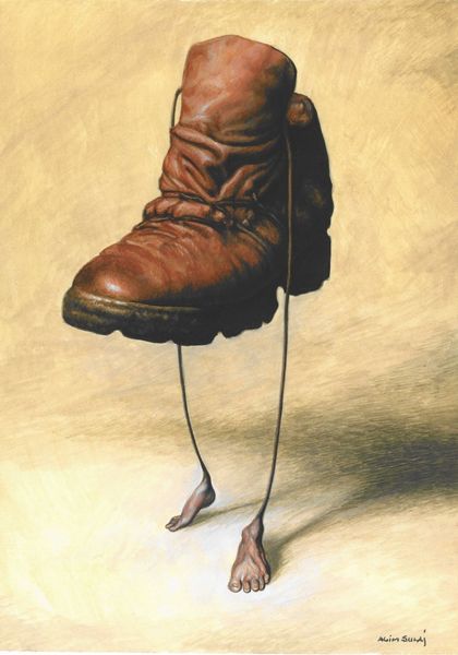 Editor: We are looking at Danny Galieote’s painting, "Strictly Business," a work rendered in oil paint. There's an undeniable tension radiating from the figure; the gun makes it difficult to look past the inherent danger. What can you tell us about it? Curator: Notice the composition. The cropped view forces our gaze onto the hands, the gun, and the stylish shoes. This immediately establishes a clear power dynamic. Editor: Power dynamic? Curator: Yes, think about the use of line. The crisp, almost photorealistic depiction of the gun contrasts with the softer rendering of the suit fabric, a masterful way of using contrast. Note also how the gleaming silver of the gun, a sharp vertical, bisects the composition, creating visual division. The geometry imposes itself upon the rest of the objects, suggesting hierarchy. What does the gaze settle on? Editor: The gun, for sure. Curator: Precisely. Even the smoke is perfectly placed. Note that without any facial features visible to the viewer, an emotionless facade allows the gun to deliver the narrative. The gun thus occupies the subject position in the structure. Does that alter your view? Editor: Absolutely. Focusing on these elements really emphasizes that stark and simple, but effective story of violence implied by the artwork, thanks! Curator: You’re welcome! It's about deciphering the artist’s intentional arrangements to see how they are trying to give a sense of something.