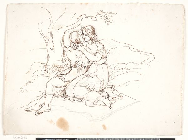 Editor: So, this drawing is called "Nymphs Find Eros Sleeping," by Lorenz Frølich, created around 1860. It’s done in pencil, and there's this really dreamy quality to it. I’m immediately struck by the way the figures are nestled within this elaborate botanical framework. How would you interpret this work, especially considering its historical context? Curator: That "dreamy quality" you pinpoint is central. Frølich worked during a time of intense national romanticism. Consider how the figure of Eros, usually active, is presented as vulnerable, passive, *found*. The title places agency with the Nymphs who are about to violate his sleep. Where would such imagery originate from in mid-nineteenth century Scandinavia? Editor: So, are you saying the image is participating in an aesthetic tradition? Are we supposed to ask, what does it say about the construction of masculinity and femininity at the time, in art? Curator: Precisely! This isn't simply a rendering of a mythological scene. Who would have been consuming Frölich's romantic images? Think about the burgeoning museum culture and the rising middle class seeking to establish a Danish cultural identity, particularly through idealized, often allegorical, representations like this one. Is Frölich commenting on this or celebrating this romantic nationalistic imagery? Is Eros representing the exhausted man and the nymphs are feminine threat to virile nationalism? Editor: It’s interesting to consider the potential socio-political implications within what appears to be just a classical scene. So it’s less about the beauty of the figures and more about the viewers for whom the drawing was created. Curator: Exactly! What happens when we re-situate seemingly universal narratives within their specific cultural and institutional frameworks? Frølich's "Nymphs" reveals the complex interplay between art, power, and the construction of identity in 19th-century Denmark. It encourages you to delve deeper beyond the idyllic surface to find the messages. Editor: I'll never look at a “simple” mythological scene the same way again. Thanks! Curator: My pleasure! Considering the artwork's reception deepens its message.