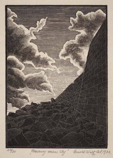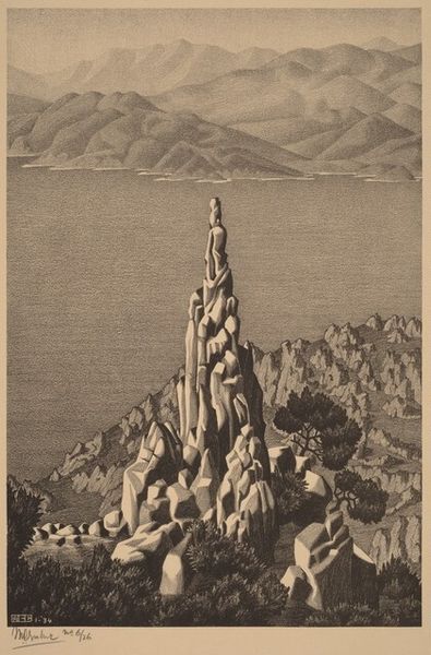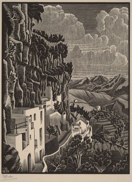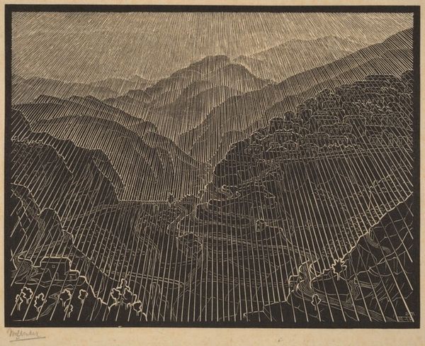 Editor: Here we have Arnold Rönnebeck's 1932 print, "Colorado Silver Mine." It's fascinating how the industrial architecture nestles within the rugged landscape; there is such geometric texture. What stands out to you as you examine the piece? Curator: Formally, it’s the interplay of line and shadow which dominates the field of vision, creating depth. Consider the receding mountains, built through the repetition of similar shapes rendered in differing gradients. The structural arrangement offers an intriguing push and pull. Do you perceive how the geometric solidity of the mine contrasts with the softer, organic forms of the mountains? Editor: Absolutely! The hard edges of the buildings really pop against the textured mountains. I’m interested in the repeated shapes, both the sharp lines of the industrial structures and the more forgiving shapes of the hills. I wonder, how does the use of a limited tonal range affect the piece? Curator: The restricted palette directs our focus to the compositional structure. Look closely at the rendering of form, achieved purely through value contrast and directional mark-making. This reductive approach to color actually amplifies the textural distinctions between the natural and the man-made. Do you find the composition static, or is there a dynamic quality achieved through these contrasts? Editor: Now that you point that out, the varying dark to light is an eye-catcher, and that tension adds dynamism. I hadn’t considered how much the textures contribute! Curator: Indeed. Reflect upon how the artist, Rönnebeck, transforms this scene through attention to structure and texture into an evocative exploration of form. Editor: This really gives me a new appreciation for the nuances of line and composition and what they can convey. Curator: Likewise, your observations are invaluable for thinking about art from new perspectives!
