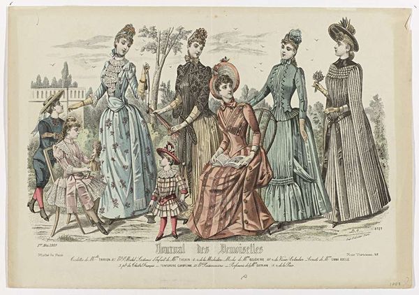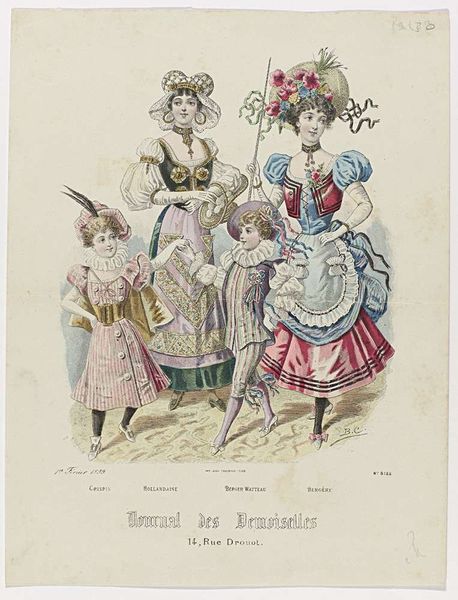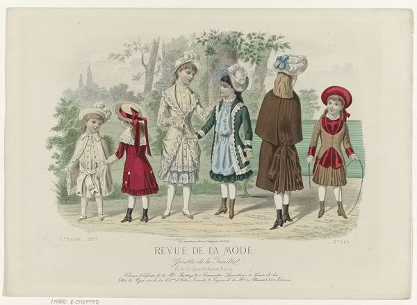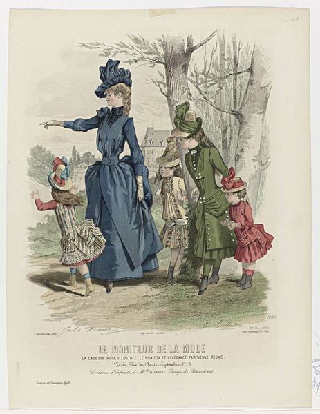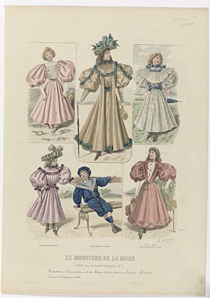 This fashion plate from 1896, titled "Le Moniteur de la Mode," presents an array of children's garments in a wintery scene. Printed in Paris, the image offers a glimpse into the sartorial expectations placed on children of the bourgeoisie. The detailed rendering of each outfit, from the elaborate hats to the tailored coats, speaks to the era's emphasis on outward presentation as a marker of social standing. Gender is subtly performed through clothing; the girls in decorative dresses and hats, and the boy in a toned down, less adorned suit. The backdrop, with its suggestion of leisure activities like ice skating, further situates these figures within a privileged context. This image, while seemingly focused on fashion, reveals a complex interplay of class, gender, and the constructed identities of childhood at the turn of the century. It makes you wonder what stories these clothes could tell.