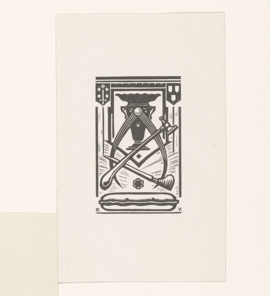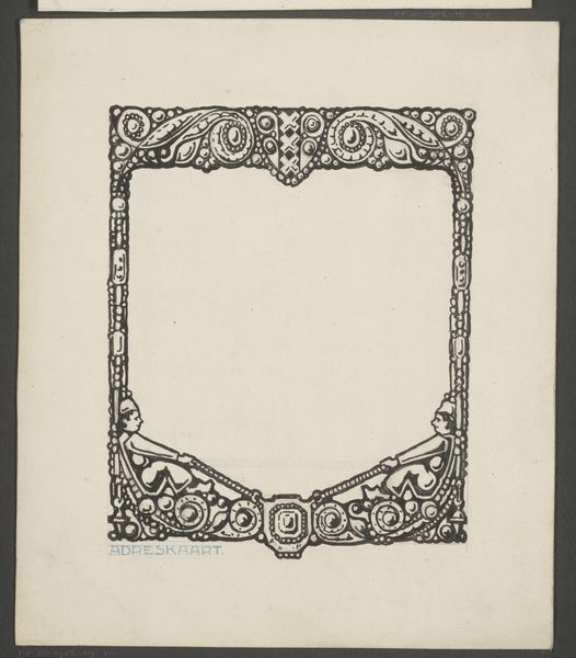 This design, 'Kader,' was made by Reinier Willem Petrus de Vries, though we don’t know exactly when. It’s probably ink on paper, judging by the graphic quality. It reminds me of artists like Hilma af Klint, who explore organic form, although de Vries's design looks more rigid. The design is black ink on a pale ground and features many teardrop shapes arranged to form the frame. There is an anchor at the bottom of the frame, and a kind of stylized bursting pod shape at the top. It's very symmetrical, and very thought out. The precision and repetition of the forms feel very considered. The black ink sits on the surface of the paper with a quiet confidence; it doesn’t blend or bleed. But it's the overall shape that really resonates, the way the frame creates a void within itself, just begging to be filled. It’s like de Vries is saying, “Here’s the structure, now it’s your turn to bring something into being.” And that’s what art is all about, isn’t it? An ongoing exchange of ideas and forms.