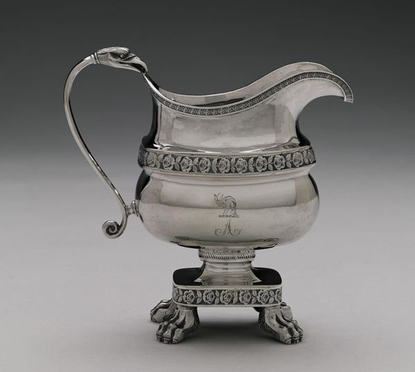 Curator: This elegant object is a Cream Jug, crafted by Paul de Lamerie, a silversmith active in the 18th century. Editor: It looks almost alive, doesn’t it? Those little legs give it such a whimsical, sprightly feel. Curator: The rococo style, with its emphasis on asymmetry and natural forms, certainly lends it a sense of dynamism. We must consider the social rituals surrounding tea and coffee consumption during this period. This jug was not just functional; it was a symbol of status and refinement, reflecting the opulence of the elite. Editor: I love how the light catches the curves. The handle looks like a blossoming vine. It whispers of secret gardens and whispered gossip over afternoon tea. The lion crest, maybe a family who poured cream in their tea while fortunes rose and fell. Curator: Indeed, the heraldry speaks volumes about its provenance. Editor: It’s a small piece of history, transformed into something beautiful. I feel more connected to those people. Curator: Exactly, it allows us to reconsider the power dynamics of 18th century society. Editor: It's amazing how something so small can hold so much.