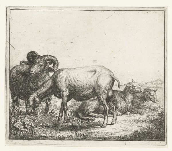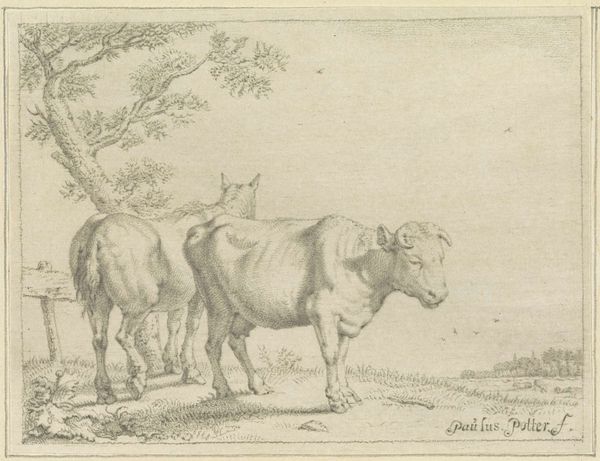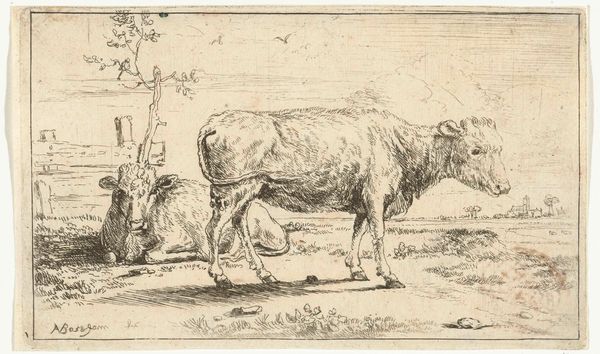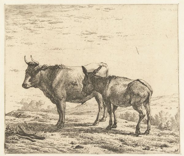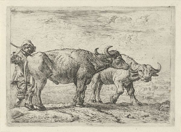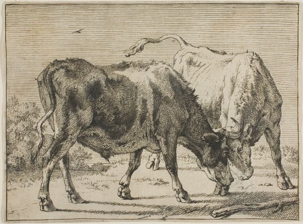 Stefano della Bella created this etching, 'Plate 7: ox, from 'Various animals', at an unknown date. Here, a large ox dominates the foreground, its form meticulously rendered through fine, closely-knit lines. The lines create a play of light and shadow across the animal's body, conveying a sense of volume and texture. Della Bella uses line and scale to explore the relationship between representation and reality. The ox is not merely depicted; it is constructed through a network of signs. We can see that the deliberate arrangement and contrast of these signs challenge the conventional understanding of space and form. This challenges fixed perspectives, encouraging viewers to question how we perceive and categorize the natural world through art. Ultimately, it is the structural interplay of line, form, and space, rather than just the subject, that creates the art's enduring appeal. These elements invite us to actively participate in interpreting its significance.