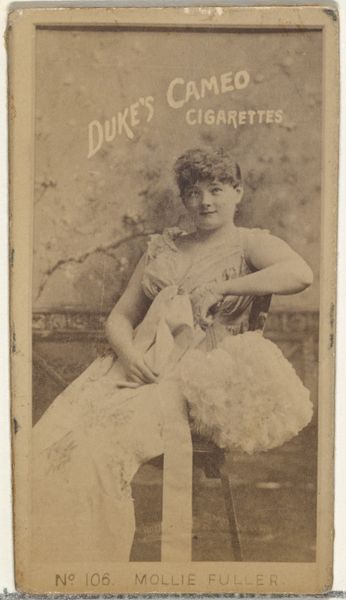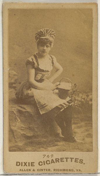 Curator: Oh, she seems so serene, almost lost in a daydream. There’s a softness to her that’s incredibly captivating. Editor: This is a photograph, specifically a gelatin-silver print, which was produced between 1885 and 1891. The piece is titled "Card 759, from the Actors and Actresses series (N45, Type 2) for Virginia Brights Cigarettes," created by Allen & Ginter. It resides at the Metropolitan Museum of Art in New York. Curator: Ah, a cigarette card! That gives the daydreaming a little bit of edge, doesn't it? I mean, suddenly she’s not just a portrait but also an advertisement… her image deployed in a kind of consumerist theater. It almost cheapens that delicate air about her, or maybe, that's part of the strange tension. Editor: Indeed, these cards served the explicit purpose of promotion, finding their way into cigarette packs to boost sales, using images of actresses and prominent figures. These sets reflect how celebrity culture was nascent in the late 19th century. Photography allowed for broader image dissemination, turning figures into commodities and objects of public fascination. Curator: Exactly! It makes you think about who *she* was outside the frame – did she get paid well? What did she think about having her face associated with tobacco? Her passive expression almost reads as defiance now, a quiet “I am more than just this pretty picture.” Editor: That’s a fascinating take. And it connects to the broader narrative around the commodification of female images and the social expectations imposed on women during this era. While the card advertises cigarettes, it simultaneously documents a shift in representation and popular culture. Curator: It's strange to hold something so flimsy, yet so loaded. This small image becomes a lens through which we view not just her, but an entire society in transition. She makes you wonder and isn't that what good art does? Editor: Absolutely. And reflecting on the function of photographic portraits helps reveal their critical impact as social documents shaping cultural memory. Thank you for sharing your impressions!