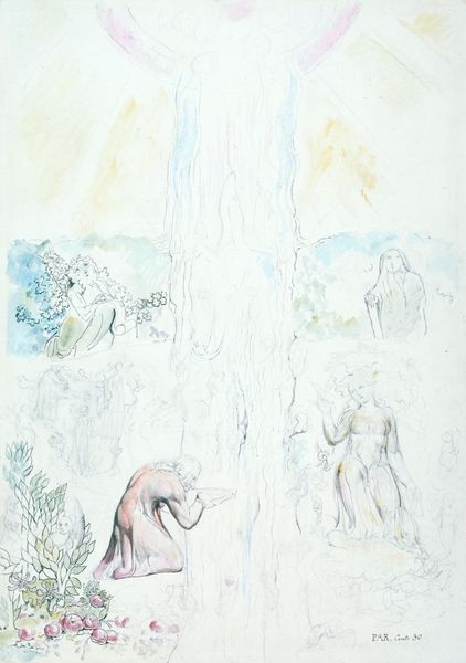 Editor: This is "Andante (Sonata of the Summer)," a watercolor painted by Mikalojus Konstantinas Ciurlionis in 1908. I'm struck by the ethereal quality and the contrasting scales between the tree and the distant tower. What can you tell me about this piece? Curator: This watercolor reveals so much about Ciurlionis’ artistic process and the resources available to him. Consider the materiality itself. Watercolor, a readily accessible and relatively inexpensive medium, was meticulously layered to create this dreamlike scene. The limited palette suggests deliberate choices, perhaps reflecting the available pigments or Ciurlionis’ own economic realities. Editor: That's interesting. So you’re thinking about the practical aspects of *how* he made it? Curator: Precisely. The painting prompts questions about the social context of artistic production at the time. Who had access to art supplies? Who could afford to dedicate time to artistic pursuits? Did Ciurlionis have patrons, or was he creating art independently, responding to market demands or personal vision? How does this inform his unique style, which merges symbolism and landscape? Editor: It's fascinating to think about how those constraints might have shaped the work. Curator: And also consider how it challenged the established hierarchies. By embracing "humble" materials like watercolor and exploring fantastical, symbolic themes, Ciurlionis challenged the traditional separation between high art and craft. Is this elevation of landscape an artistic act of defiance or an acceptance of his circumstances? Editor: I hadn't considered the challenge to hierarchies like that before. So it’s not just the subject matter, but also the means of making art, that are important here. Curator: Exactly. And by thinking about it that way, we can uncover deeper meanings about the artist's relationship to his society and artistic norms. Editor: This has really opened my eyes to a completely new way of looking at art. Thank you! Curator: My pleasure. Always remember to consider the materials, methods, and the world they come from!
