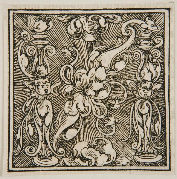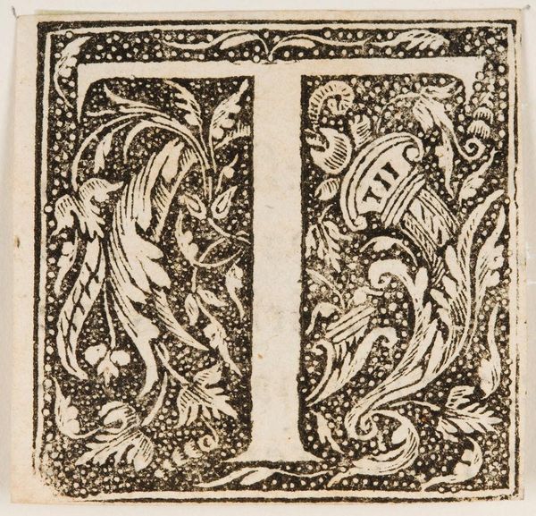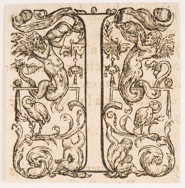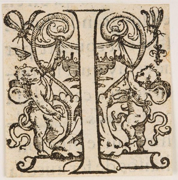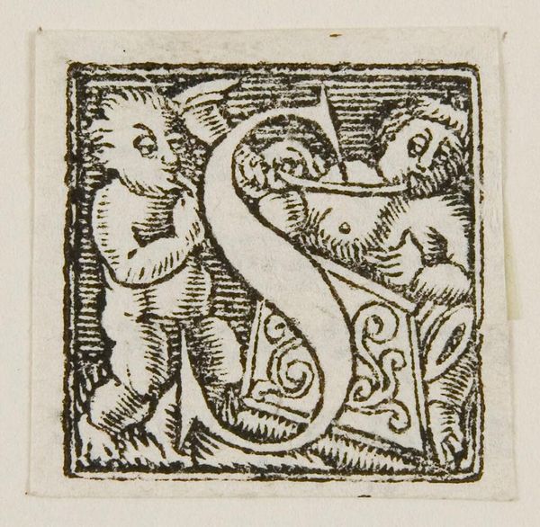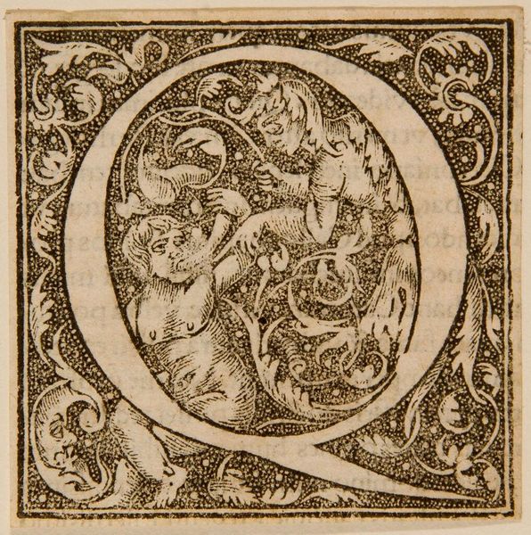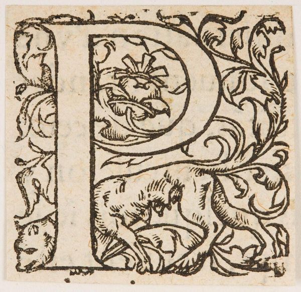 Editor: This is "Letter P," by an anonymous artist, and what strikes me is how alive it feels! What do you make of all this activity within a single letter? Curator: It’s like a little world, isn't it? An initial like this would have popped up in a book, maybe at the start of a particularly pious passage. I see horses, figures wrestling…it feels almost medieval, doesn't it? Like a tiny illuminated manuscript page. Editor: It does, and with so much going on, I wonder, is there one dominant symbolic element? Curator: Perhaps the struggle itself. The "P" could stand for penance, piety… the internal battles we all face. What do you think? Editor: It certainly lends the letter more depth than I initially imagined. I'll remember that next time I see an initial like this. Curator: Absolutely, look closer, and the letter becomes a portal.