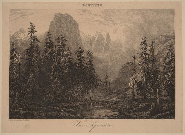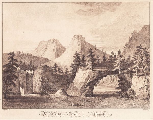 Curator: J.F. Clemens' "Musiken til Balletten Lagertha," created sometime between 1748 and 1831, greets us with an intriguing landscape scene, rendered with watercolour, colored pencil and print. Editor: It strikes me as almost theatrical – a painted stage backdrop, the muted colors and somewhat naive perspective lend a fairytale-like quality. Curator: I see that too! Lagertha, as a figure, pulls from Viking legends. So the backdrop isn't merely decorative. It represents a deep yearning for a romantic, heroic past and also serves to place her character in a meaningful context, the nature itself reflects her own fierce, untamed spirit. Editor: The layering of the landscape and muted tonality suggest a fascination with natural resources and their alchemy. This pre-industrial vision relies on earth pigments and their laborious production to simulate raw materials. Look at how that pigment sits on the paper itself. Curator: I’m drawn to the arch formation of the rocks in the midground, a symbolic threshold, almost like a natural proscenium framing the suggestion of water beyond. Arches symbolize transitions and passages, hinting at Lagertha's transformative journey within the ballet, as well. Editor: It is really quite remarkable that despite its size, the print's process seems to point to this slow consumption, with the eye following each color layer—was the average person aware of the resources to make these objects and stories? Or only of its price? Curator: An interesting point. The landscape is romanticized, but what of the romanticized labor that went into representing such beauty? It is a fascinating question to keep in mind as we proceed in our analysis of artistic legacies and visual rhetorics. Editor: Agreed. Examining how things are made makes you look differently.