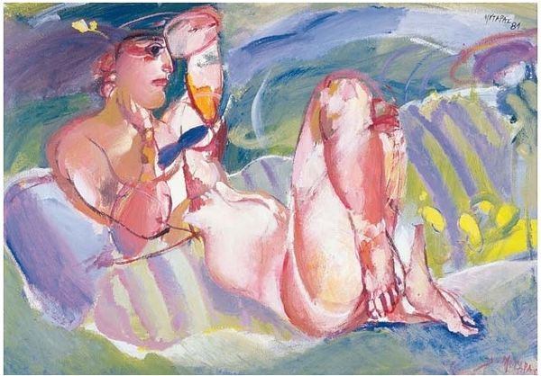 Editor: We’re looking at “At the Water’s Edge,” an oil painting by Ossip Zadkine, created in 1932. There’s a serene quality to it, even though the figures are rendered with such… simplified forms. What strikes you most about the composition? Curator: The stark juxtaposition of form and light. Observe how the geometric boat sits nestled behind the nudes. Its presence amplifies their organic curvature, inviting reflection on humanity's relationship with nature and the artificial structures we create. Consider also how the palette operates, restricting itself to a primarily subdued range of cool colors to then heighten our understanding of warmth. Editor: So the artist’s choice of those softened cool tones against the figures adds depth? Curator: Precisely. Note, too, the curious spatial ambiguity. The perspective flattens, creating a compressed stage. We observe how line and plane work to both conceal and reveal aspects of the figures. Where do you feel this manipulation of spatial awareness succeeds or fails? Editor: It's almost dreamlike, the lack of a clear background or setting. It keeps me focused on the relationship between the figures and their interaction with each other and the boat. Are they together, are they apart? The ambiguity pulls you in. Curator: It evokes questions of boundaries, identity, and perception, especially because of how that soft-blurry almost white light renders and bathes these nude forms. The work offers a compelling investigation into form itself. Editor: I now appreciate how Zadkine used the color palette and rendering techniques to suggest a complex relationship between the figures and the constructed shape of the boat. Curator: It’s about observing how the artwork uses these intrinsic, self-referential qualities. That offers us pathways to unpack more subtle meanings, regardless of outside references.