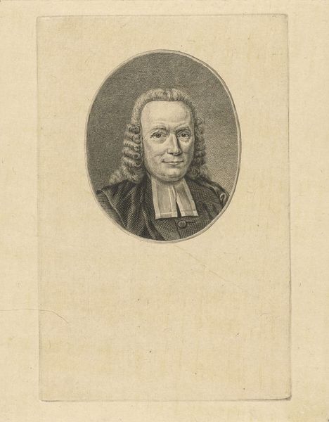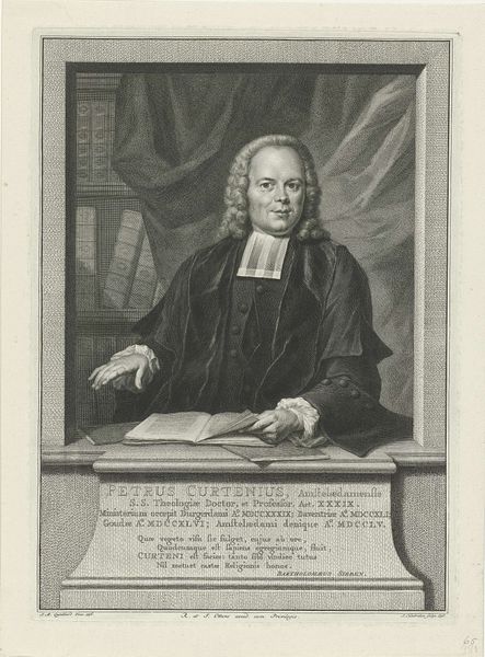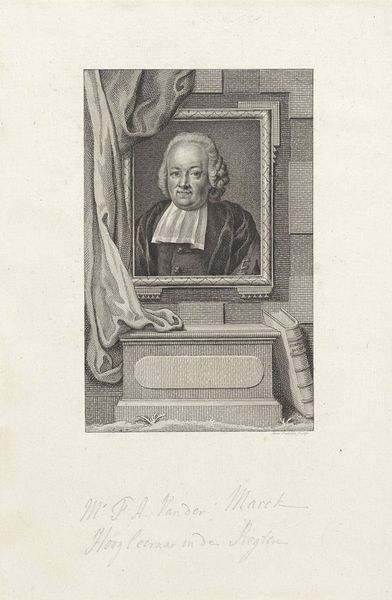 Editor: This is Jacob Houbraken's "Portret van Leonard Offerhaus op 75-jarige leeftijd," created around 1774-1775. It’s an engraving on paper. What strikes me is how it's framed like a window or a stage – almost theatrical. What do you make of it? Curator: It’s certainly staged, isn’t it? Look at the institutional framing. The portrait's setting and the subject’s garments – the scholarly robe, the book he holds – signal Offerhaus's status. He wasn’t just anyone; portraying him this way reinforced his social standing. How does that resonate with you? Editor: It feels…deliberate. Almost like an advertisement for being learned. Was portraiture often used in that way? Curator: Absolutely. Think about the power dynamics at play. Houbraken, the artist, is commissioned to create an image that elevates Offerhaus, a respected scholar, further solidifying his place in society. The printing process allows for wider distribution, effectively creating a public monument to his intellect. Did many people have access to see such a piece at that time? Editor: Probably only those who could afford it, or who visited specific institutions like libraries or universities, right? Curator: Precisely. These images circulated within specific social and intellectual circles, reinforcing existing hierarchies. The books behind him, the somber colors...everything points to learnedness and status. So what, would you say, is its overall public role at that time? Editor: It would serve as propaganda and to reinforce hierarchies for certain groups within society and reinforce what the institution thinks is valuable, or important. I suppose, now, its public role is in remembering a notable figure from the past and it is open to anyone who visits or sees this engraving. Curator: Indeed. And reflecting on that shift allows us to see how art functions as a social mirror, reflecting – and sometimes shaping – the values of its time. Editor: It’s interesting how an image can be so carefully constructed to convey such specific ideas, even centuries later! Curator: Yes! And it's the careful construction that holds so many historical narratives within its lines and composition.