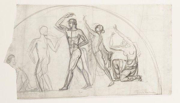 Curator: This is "Studies for the Painting of the Descent of Sarrazins on the Port of Ostie" by A. Claude Philippe de Thubières comte de Caylus, held at the Harvard Art Museums. It provides insight into historical narratives and artistic processes of its time. Editor: The linear quality gives it a sense of immediacy, almost like figures caught mid-action. The bodies have weight, and the ink strokes feel deliberate, but not quite finished. Curator: Caylus was a prominent figure in the 18th century, heavily involved in the Royal Academy and archaeological pursuits. He directly shaped the artistic discourse through his patronage and writings. Editor: The almost sculptural treatment of the figures suggests a fascination with form and labor. What interests me is how he uses the etching to examine physicality. Curator: Absolutely. We see a Neoclassical interest in the heroic, tempered by a desire to understand and classify the world around him, visible in the study's medium and function. Editor: It’s a study, so we're seeing the materiality of artistic planning, not just the finished product. It's revealing to consider how the means of production inform our understanding. Curator: Indeed, it speaks volumes about the social and intellectual currents of the time. Editor: A fascinating glimpse into the artist’s process.