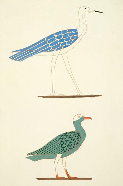 Curator: Here we have Charles Herbert’s "Bird, after Egyptian Wall Painting," housed here at the Harvard Art Museums. Editor: Immediately, I sense a calm simplicity, almost meditative. The earthy tones and minimalist lines feel both ancient and modern, somehow. Curator: Herbert, active in the late 19th century, made several copies of Egyptian art. These reproductions reflect the Victorian era's fascination with Egyptology and played a role in disseminating Egyptian aesthetics. Editor: It's interesting how a copy can become its own distinct work. The reduction of detail, the conscious line work, it transforms the original into a new, more graphic statement. It makes me think about appropriation in art. Curator: Yes, and these copies helped to shape the public's understanding of ancient Egypt, even if filtered through a Western lens. Editor: Well, it makes me want to go back to the source! See what Herbert saw, and consider both visions.