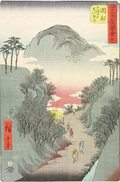 Curator: Ah, the serenity! Hiroshige's "No. 5, Hodogaya" from his series "Famous Sights of the Fifty-three Stations" just washes over you, doesn’t it? Editor: Indeed! The high horizon line gives it a sense of expansiveness, almost as if we're peering into a world unfolding below. The palette, dominated by greens and blues, is incredibly calming. Curator: It's more than just calming, though. Those little figures in the posthouse, with their red lanterns, are like tiny beacons of human connection within this vast landscape. It's a beautiful commentary on our place within nature. Editor: Yes, and the composition leads the eye from the foreground to the distant mountains with a gentle, almost musical rhythm. The stylized rendering of the trees is fascinating, too. Curator: Hiroshige's clever, isn't he? He captures the essence of Hodogaya, this stop on the TÅkaidÅ road, without being overly literal. I think that's what makes it so captivating after all these years. Editor: Absolutely, it's a wonderful example of how formal structure can beautifully amplify emotional content.