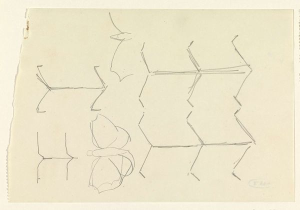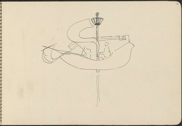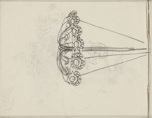 Curator: Here we have a preliminary sketch by Carel Adolph Lion Cachet, dating back to around 1905, titled "Ontwerp voor een elektrische hanglamp" or "Design for an Electric Pendant Lamp" now residing here at the Rijksmuseum. It's rendered with pencil and ink on paper. Editor: It looks almost like a diagram, quite stark and functional at first glance. But those delicate flourishes hint at something more decorative, perhaps even symbolic. What exactly did people expect of this design in its era? Curator: It’s a fascinating intersection of the practical and the aesthetic. The late 19th and early 20th centuries witnessed the rise of electricity, becoming integrated into the everyday lives of people, with electric lighting slowly becoming ubiquitous. And Cachet, immersed in the Art Nouveau movement, likely viewed this not just as functional technology but an opportunity to blend artistry into this new electrical era, reflecting societal shifts and values. Editor: Yes, Art Nouveau. You can see it now in the swirling motifs. Electric light, newly embraced—that must have held significant promise for the future. There's something alchemic, almost, about turning darkness into light with such nascent technology. The choice to embellish it transforms what could have been simply functional. I'm curious to think about light, of knowledge being suspended above like a gift. Curator: That idea of light as knowledge ties directly into how the upper classes viewed art's ability to elevate. It was not just decoration. For Cachet, function could never merely be the thing itself; there's a social responsibility there, embedded in making daily life inherently aestheticized. Even a humble lamp is about communicating the status of the homeowner who procured it. Editor: A coded message delivered in illumination, yes. Seeing how rudimentary this sketch is gives some idea to what would have ultimately translated into wrought iron or stained glass, but the seed of design and that deeper intent existed at the start. A very modern integration of practicality with ideals, or at least aspirations. Curator: Absolutely, we glimpse not only a beautiful lamp, but also social attitudes, ambitions around art’s social influence. Editor: Makes one ponder the values imbued in today's technology and how artists might be encoding those new meanings. Curator: Exactly, different medium, similar societal intentions, really.
