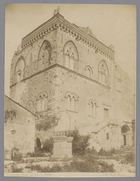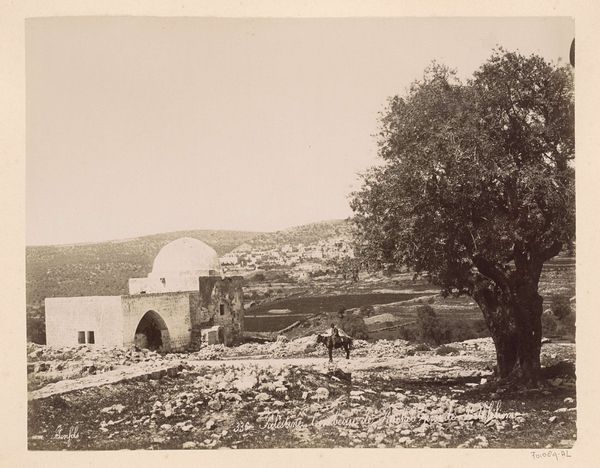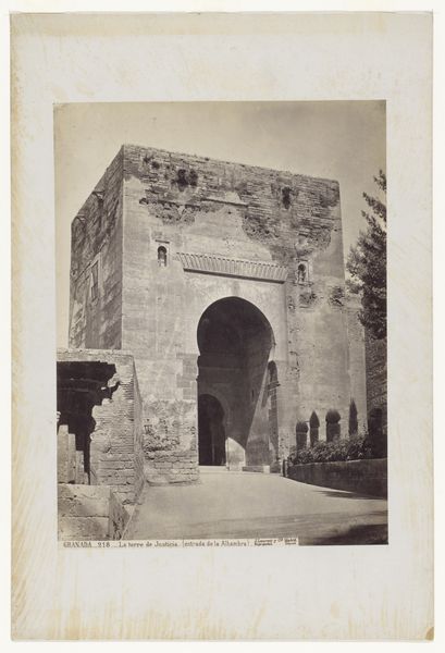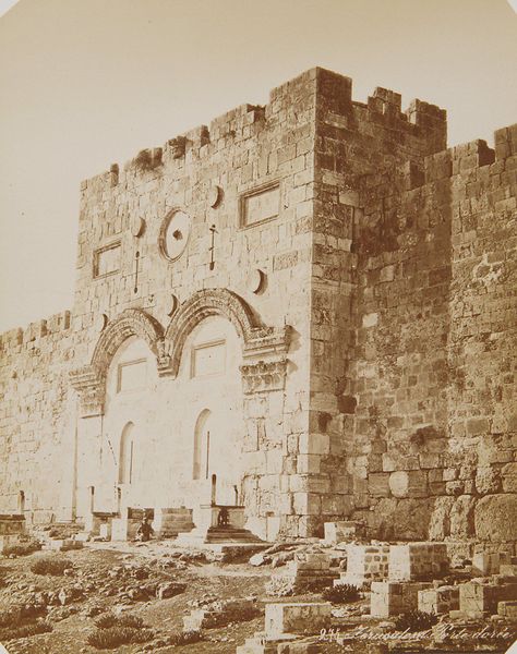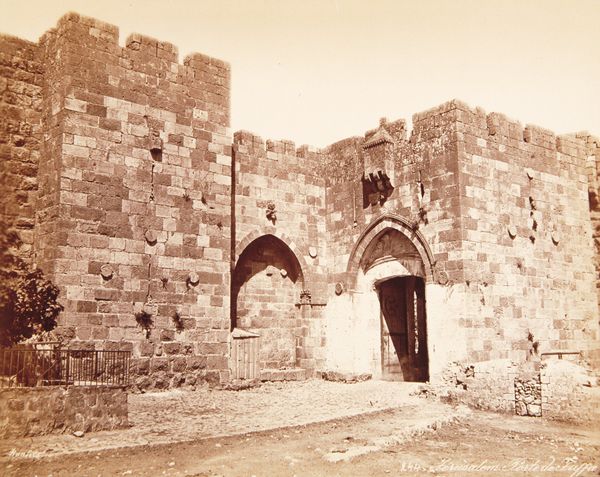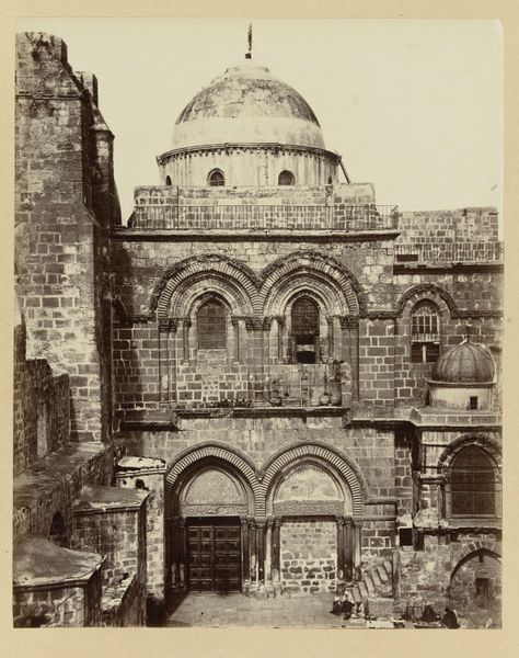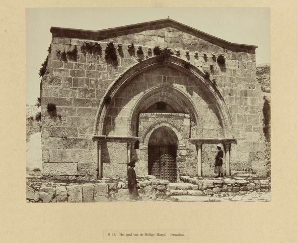 Editor: Here we have "Grave of the Virgin Mary and the Grotto of Agony in Jerusalem," a photograph from sometime between 1867 and 1895, by Maison Bonfils. It feels so austere. The stone architecture is monumental but stark. What do you see in this piece from a formalist perspective? Curator: I see a fascinating study in architectural form and light. Observe the geometric clarity: the severe rectangles of the main structure contrasting with the rounded archway, which repeats on a smaller scale inside the entry. Note how Bonfils uses light and shadow to articulate the textures of the stone. Where does your eye lead? Editor: My eye is drawn to the entrance, specifically that darker, smaller archway within the larger one. It creates a sense of depth and mystery, beckoning the viewer inward. Curator: Precisely. The play of light and shadow also structures our perception of depth. Notice how Bonfils positions the figures? How do they affect the geometry of the scene? Editor: The figures, though small, punctuate the composition, don't they? Their vertical lines break up the horizontality of the architecture, adding a human element. The tonal range, especially the darker robes, seem to reiterate the darker, receding arch. Curator: Indeed. Bonfils has a keen sense of visual weight and balance. I'm also curious about the surface of the print. What can it tell us? Editor: The slightly faded, sepia tone gives it a feeling of antiquity, doesn’t it? Makes the scene look even more historical and…distant. Curator: Precisely. These are the intrinsic elements that make this work compelling regardless of subject matter. A fascinating confluence of light, form, and material. Editor: It’s interesting to see how focusing on form reveals so much. Thanks for your insights.