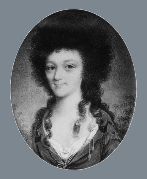 Curator: My first impression is… vulnerability. There’s something almost spectral about this miniature. Editor: Indeed. What we’re looking at is a pencil drawing by Edward Greene Malbone, made between 1795 and 1798, titled “Mrs. James G. Almy (Myra Eliot)." Curator: It's small, right? These miniatures are so intimate. It feels like I'm holding a secret, gazing at this woman's likeness. The details around the lacy shawl are beautifully rendered, capturing its ephemeral, delicate presence. And those eyes... they really draw you in. Editor: The intimacy of miniatures provided an accessible, personal way of commemorating individuals in the late 18th century. What’s particularly interesting here is how Myra Eliot is presented. Her gaze is soft, yes, but direct and engaging. We see a departure from hyper-idealized representations and perhaps more attention to the personality of the sitter. Curator: Absolutely. I love that suggestion of the 'real' person breaking through. The artist isn't simply creating a symbol of beauty, but revealing something human. Did you notice the curls springing wildly from her head, creating a frame? To me, they almost create the mood of a storm, or perhaps a cloud enveloping the calm below. Editor: I see what you mean. It's also fascinating to consider the social positionality of women at this time. Her gaze and delicate clothing place her within a specific societal framework. Myra's class status is affirmed by her refined demeanor and dress, and simultaneously there is a very delicate subversion to this notion given the curls you mention, disrupting the very composed effect the artist sets out to create. Curator: It's like the portrait's wrestling with itself: stillness and motion; status and soul... Malbone's work invites us to not just see, but also to deeply reflect on who we were and who we could be, especially as we continue navigating this complicated moment in time. Editor: Absolutely, a dialogue with the past through a feminist lens enables us to recontextualize it, discovering the nuanced, multifaceted representations of the feminine even when it seems absent on the surface. These conversations enrich our experience with the piece beyond its face value.