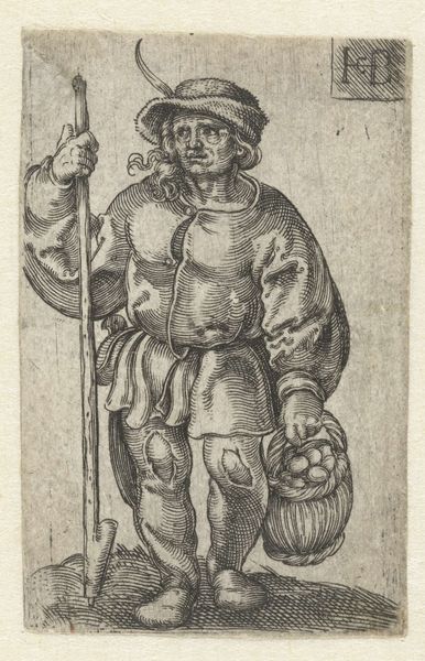 Editor: So, this is "Vaandeldrager," created sometime between 1529 and 1610. It's an anonymous piece, found in the Rijksmuseum, done as an engraving. There’s almost a comic roughness to the lines, but this man…he looks so serious and proud. What echoes do you hear from this image? Curator: Echoes, yes. He carries more than just a flag. The standard-bearer is a potent symbol – a container of ideals, almost a human reliquary, entrusted with cultural memory. Consider the wild game he also carries; a more primitive prize suggesting more basic societal drivers, that predate symbolic representation, namely sustenance and survival. Note, too, the strange image on the tree next to him. What does it remind you of? Editor: A crest, maybe? Or a brand of some kind? Curator: Precisely. It speaks to the individual’s association with something larger – be it family, guild, or state. A visual reminder of an individual's cultural role. It provides a social echo to the central figure in the print. What do you suppose someone looking at this image 400 years ago would have felt, seeing that crest? Editor: Pride, perhaps, or kinship… or maybe the opposite, exclusion. I see what you mean about cultural memory; those symbols create powerful links. Curator: And see how his costume reflects rank and cultural value at once! A lot of this is echoed today, in our flags, and insignias and emblems. We might not be charging into battle, but we're still carrying those old ideals forward in modern ways. Editor: So much history encoded in one image! I’ll definitely look at symbols differently now. Curator: Agreed, the image itself is like a container of meanings, and seeing them can change how you understand the world around you.