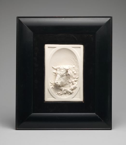 Editor: Here we have "Mrs. William Power (née Shed)," a miniature ceramic sculpture from the 19th century. It is incredibly small, and at first glance, the precision and delicacy of the carving strike me most. What elements of form stand out to you in this piece? Curator: Immediately, the contrast between the pale cameo and the stark black frame demands attention. The artist masterfully manipulates texture; note the smooth, almost porcelain-like finish of the portrait against the more matte texture of the frame. Consider, also, how the artist uses the limited depth of the medium to create an illusion of three-dimensionality through subtle gradations in relief. Editor: Yes, the almost total lack of color forces you to focus on those textures. I find the geometry fascinating too, all of the rectangular shapes soften into ovals: the cameo in an oval, the frame in a rectangle. Curator: Precisely. The interplay of geometric forms, softened by the organic curves of the portrait, is critical. And note the careful arrangement of lines – the crisp, clean lines of the neoclassical profile against the more decorative, almost Rococo-like flourishes in her attire. This generates a fascinating tension. What impact does the size have, in your opinion? Editor: Its small scale creates an intimacy. You really have to get up close to appreciate the detail. So how do all of these choices interact? Curator: The artist orchestrates line, texture, and form into a unified composition that highlights technical skill. Its dimensions foster engagement by demanding close looking. It presents a controlled and self-contained world, devoid of extraneous detail, where every element serves to emphasize both surface qualities and structure. Editor: I see it now; the beauty is in the interplay of these contrasting textures, shapes and styles, each contributing to a unified, striking whole. Thanks! Curator: Indeed, a rich interplay of elements elegantly brought together.