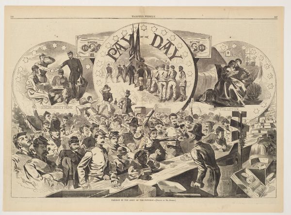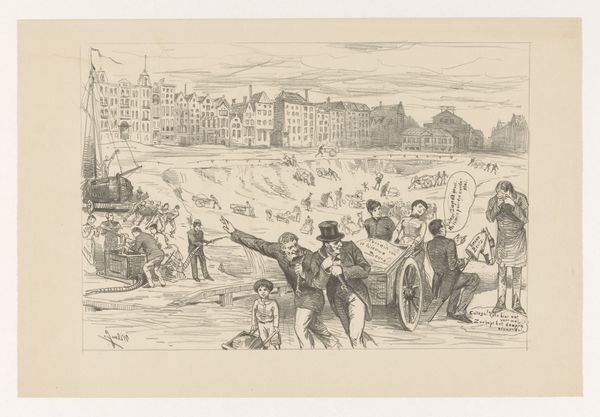 Curator: This lithograph, made with pen and ink, is called "Spotprent op de overdreven vrees in Nederland voor de in België heersende pokkenepidemie, 1880," created in 1880. It roughly translates to "Cartoon about the exaggerated fear in the Netherlands of the prevailing smallpox epidemic in Belgium." What's your initial reaction? Editor: My eye is drawn to the hanging cow! It creates a disturbing focal point, suggesting something is amiss. The dense crowd feels restless, contributing to an overall anxious and chaotic mood. Curator: Exactly! This piece serves as visual commentary, reflecting on the social anxieties around public health during that time. We can interpret the means of disseminating and manufacturing public opinion via caricatures and printed posters to better understand the labor involved in creating social norms and behaviors. The lithograph served as a form of popular media, a challenge in its way of what might be termed ‘high art.’ Editor: Indeed. The method of print production itself made the cartoon accessible to a wide audience, becoming a tool of influence and social shaping, beyond class status. But tell me, what societal dynamics are specifically in play that give rise to the creation of this? Curator: It critiques Dutch society’s response to fears surrounding a smallpox epidemic in Belgium. By exaggerating those anxieties through caricature, the print highlights themes of xenophobia and nationalism, portraying Dutch citizens as excessively fearful and perhaps even irrational in their reactions. We might also investigate it with postcolonial undertones given Belgium was the younger, smaller and less prosperous state versus the historic Kingdom of the Netherlands. Editor: The presence of the cow is also critical. I imagine the cow symbolizes the source of the smallpox vaccine at the time: a representation of animal labor integral to human well-being, albeit tinged with fear in the popular imagination. The text referring to steam suggests some advanced processing took place as well. Curator: Precisely. Its very design implicates institutions and the people’s anxieties, which reminds us that the consumption of information surrounding it—medical, governmental, and cultural—are products, too. Editor: Looking closer, this cartoon delivers an acerbic commentary on the manipulation of public sentiment in 19th century Netherlands! A reminder of the potential weaponization of fear then as much as today. Curator: And how the processes of making and distribution are intrinsically connected to the social effects an image produces.