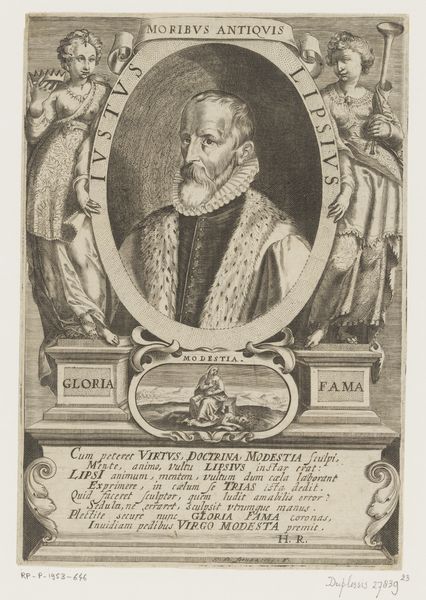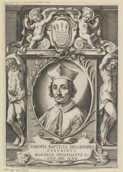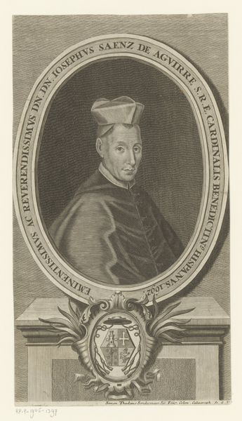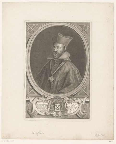 Editor: We're looking at a portrait here: "Portret van kardinaal Berlinghiero Gessi" created around 1636-1672 by Lorenzo Tinti, using print and engraving techniques. It feels very formal, with the subject framed in this ornate oval. What elements of its design stand out to you? Curator: The visual structure of the piece immediately arrests the eye. The contrast between the clean lines of the Cardinal's face and the intricate detailing of the surrounding cartouche creates a fascinating tension. Note the composition is meticulously balanced: the weight of the inscription is offset by the heraldic symbols and ecclesiastical regalia at the bottom, anchoring the portrait. How do you perceive the function of the text around the portrait? Editor: I see it more as decorative. It creates this sense of importance but its function doesn't go beyond this. Curator: Indeed. The lettering, meticulously engraved, serves as both frame and identification. The balance of text to image showcases a carefully constructed visual hierarchy, doesn't it? Consider how the textures, achieved through varying densities of line, define both form and shadow, particularly in the Cardinal's robes and face. What impression do the rendering and style create? Editor: There's a rigidity that is characteristic of its era, but is balanced with a decorative element, mainly through the frame of the image, softening the mood with its wreaths. It creates this odd push and pull feeling. Curator: Precisely. And, perhaps unexpectedly, it humanizes the sitter; The engraver gives as much detail to the face, almost betraying his personality as is given to the formal heraldry that speaks of the institution. Note also the use of semiotics present here and how such structural cues emphasize the formality of the Baroque style. Editor: This perspective really highlights how even seemingly decorative choices play such vital roles in shaping the overall impact! Thank you. Curator: Indeed. A close look at the intrinsic qualities reveals the underlying order and intention.