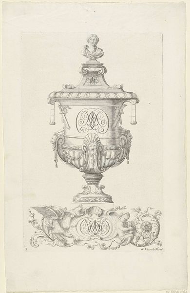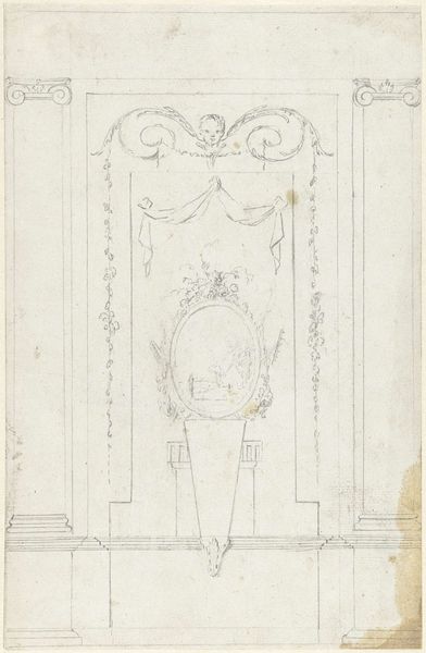 Curator: This intricate drawing, "Udkast til en drejet opsats med Frederik V.s buste," which translates to "Draft for a turned stand with Frederik V's bust," was rendered in 1751 by Lorenz Spengler. I see a careful drawing, very architectural, obviously intended as a design for a three-tiered sculptural object of some kind. It looks top-heavy! Editor: My initial thought is how revealing it is about power. To me, this sketch for a display piece speaks volumes about the commodification of royalty and the methods used to reinforce hierarchies. Curator: Well, as a materialist, what catches my eye is how it exemplifies neoclassical aesthetics filtering into applied arts and craftsmanship. Spengler's careful rendering of this projected object reveals an ambition to elevate craftsmanship to the realm of high art, doesn't it? How the artist envisioned its production, the choice of material, whether it be silver or porcelain. Editor: And it's precisely that interplay of neoclassical form and royal portraiture which highlights the deliberate construction of identity and the reinforcement of power dynamics during that time. Every flourish, every curve, seems designed to legitimize the monarchy, don't you think? Curator: Yes, that connection between the physical object and social authority interests me. This piece, should it have been made, would’ve occupied physical space and would have acted as a conduit of value. Who would have been involved in the fabrication process? How many hours of labor? What’s so fascinating here is to explore how class and craft intersect through this decorative stand. Editor: Absolutely. Thinking about the era and the societal pressures, I'm reminded that this elaborate design wasn’t just about aesthetic appreciation. But, I am struck by how fragile it appears despite what was, supposedly, rock solid. Curator: That tension—the precariousness of power symbolized in delicate porcelain versus its monumental intentions—makes the object incredibly compelling, and highlights what is not yet materially defined, how much it exists solely in the conceptual, at this early stage in its creation. It certainly gives a lot to consider! Editor: Indeed, a striking glimpse into the social theatre of the 18th century and all its performative, constructed grandeur.