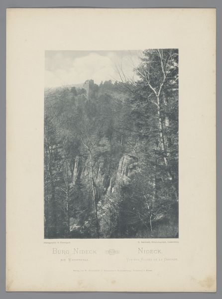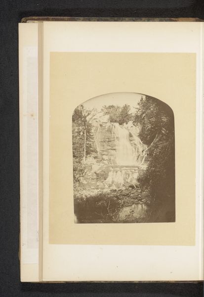 Editor: So, this is Charles Bernhoeft’s "Waterval bij Seebach," a gelatin silver print from before 1894. The cascade is lovely, but there's a melancholic stillness to it, like a captured moment of a fleeting experience. What catches your eye when you look at this? Curator: Isn't it funny how a frozen waterfall can evoke so much flow? It reminds me of trying to hold onto a dream, just slivers and whispers remaining. Beyond that initial impression, though, I'm struck by how Bernhoeft uses light to almost sculpt the water, making it feel incredibly tactile. Does it draw you in that way? Editor: It does, actually. The contrast is quite intense. There’s something ethereal about the cascading water against the density of the dark trees. What does the framing achieve here? Curator: The dark frame feels like a deep breath, a prelude to the lightness of the cascade. In many ways, the image mirrors our internal world - where shadows dance with the most vibrant streams of consciousness. Do you think Bernhoeft saw his world in stark contrasts, and wanted to highlight that with this contrast technique? Editor: Perhaps. It also draws my eyes immediately to the bright fall. Curator: Exactly! By manipulating light and shadow, Bernhoeft directs our gaze. In this "Waterval bij Seebach," the landscape mirrors the journey from the tangible to the dreamlike. It's Bernhoeft whispering secrets. Editor: It's almost as though you're there. I appreciate your seeing this piece through the eyes of the artist's emotional perspective.