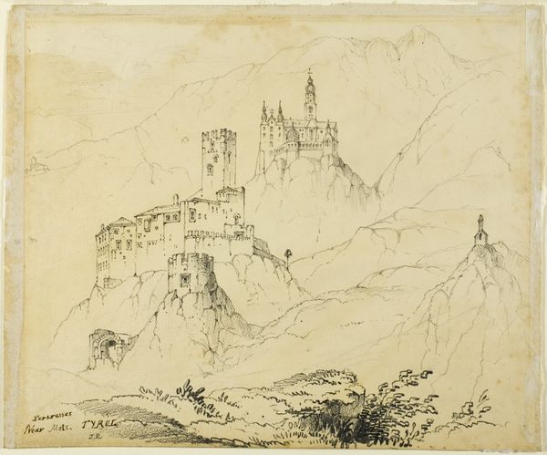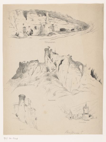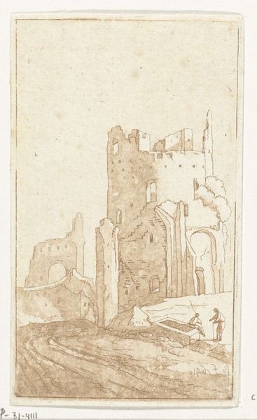 Curator: Here we have Frederik Hendrik Weissenbruch's "Vervallen toren van een kasteel," a pencil drawing from between 1838 and 1887. It currently resides in the Rijksmuseum's collection. Editor: My first thought is how melancholy it is. The crumbling stonework and lack of detail evokes a sense of transience. Curator: The stark composition certainly amplifies that feeling. Note how Weissenbruch uses varying densities of lines to create depth and shadow. The ruined tower dominates the page, its verticality a counterpoint to the gentle slope it rests upon. The interplay of light and shadow almost abstracts the subject, distilling it to its essential form. Editor: I see the evidence of labor in every stroke of the pencil. Think of the quarrying of stone, the hands that meticulously built this structure, only for it to erode slowly back to its elemental state. It reflects the ultimate futility of even the grandest human endeavors. What type of pencil did Weissenbruch likely use to produce such contrast, do you imagine? And was the support handmade, I wonder? Curator: The Romantic painters often focused on nature's power over humanity. This image certainly aligns. It possesses an underlying sublime quality that resonates even in its miniature format. But it's not simply a record of ruin; consider also the positive negative spaces, where emptiness becomes significant. Editor: I am drawn to consider who inhabited this place, and what the communities that relied on this structure endured as it gradually failed. Perhaps it sheltered artisans, who used the resources provided from the surrounding lands? We only view the romantic facade, seldom the stories of material and labor involved. Curator: A pertinent observation! Though formally, one can analyze its formal elegance; the artist skillfully arranges visual weight so the eye meanders satisfyingly from its base to the pinnacle and downward again, locked into place, looping between dark stone and negative void. Editor: Considering the materiality definitely amplifies its sense of longing for a bygone era. The building materials whisper their own forgotten stories, their gradual disintegration embodying both the relentless effects of the weather and of history. Curator: Indeed. These juxtapositions produce such an atmosphere of brooding contemplation. Editor: Ultimately, its success lies in that careful and emotional blend of materials, subject matter, and the implications for the hands both responsible for building, and later capturing, this long-lost monument.