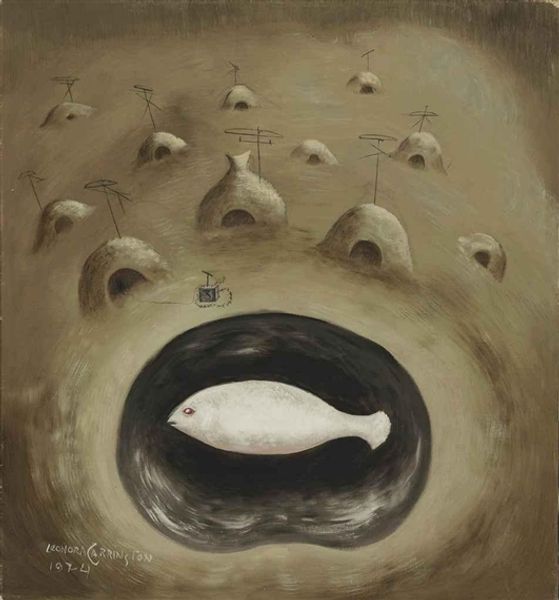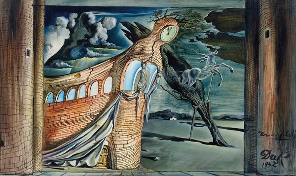 Curator: This unsettling yet compelling artwork is titled "Carcase in Swamp." Sidney Nolan rendered it with oil paint in 1955. What are your initial thoughts? Editor: Visually, the first thing that strikes me is the subdued palette – the earthy browns and blues create an atmosphere of decay and stagnation, beautifully amplified by the texture. It's a somber composition that speaks of something primordial. Curator: Yes, the subdued tones certainly enhance the painting's aura. It reminds me of primordial mythologies. This 'carcase,' I think, operates as a modern-day leviathan or chthonic deity, embodying hidden dread in the landscape. Nolan frequently employed mythological or legendary figures in his paintings as metaphors for psychological truths. Editor: Interesting point. Formally speaking, notice how Nolan uses stark vertical elements—those blackened post-like forms rising above the carcass. They create a sense of upward movement and yet are countered by the horizontality of the swamp, the dead, white animal figure. Curator: Those vertical elements resonate with symbols of mourning – think of totems or forgotten sentinels guarding the passage between realms. Perhaps the swamp environment alludes to liminality. Death here is not final but transitional, suggesting a complex and layered reality just beneath the surface. It touches upon a raw human vulnerability. Editor: Definitely. Speaking of surface, there is a clear contrast in brushwork; the sky and swamp are rendered loosely, even blurred, contrasting with the relative smoothness of the animal carcase, drawing the viewer’s focus in. It gives it a tangible weight and immediacy amidst the ethereal decay. Curator: I find the carcase to be less literal and more emblematic. Its blankness is unnerving and mirrors humanity confronting mortality without comforting narratives. I imagine it echoing our anxieties toward death—a reflection on the cyclical relationship between creation and annihilation, a visual poem on what's lost. Editor: Indeed, a striking example of expressionism. This canvas, with its bleak subject, prompts reflections on our ecological footprint on the natural world, still haunting us even 70 years on. Curator: It is precisely the work’s visual enigma and its enduring capacity to tap into shared cultural memories that continues to captivate me.
