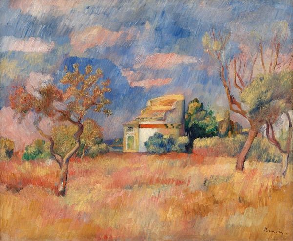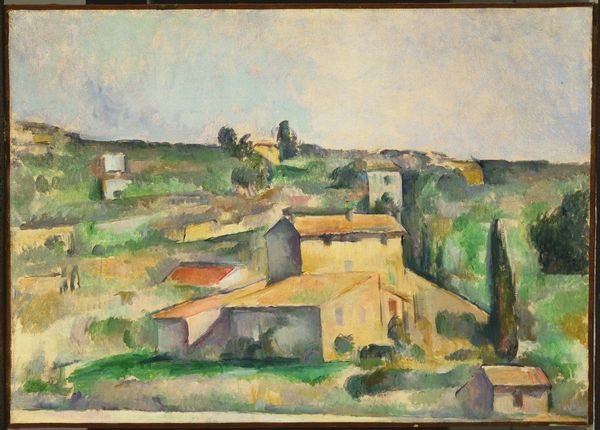 Paul Cézanne painted "The Pigeon Tower at Bellevue" using oil on canvas, capturing a scene dominated by a cylindrical tower amidst lush greenery and a serene sky. The composition is built on a structure of contrasting colors and forms, where the warm hues of the earth and building meet the cool blues and greens of the sky and foliage. Cézanne's brushwork is crucial here; each stroke is deliberate, constructing form through color modulation rather than traditional linear perspective. This approach destabilizes conventional representation, pushing toward a flattened space where objects are defined by their chromatic relationships. The tower, for example, isn't merely depicted; it's constructed through layers of paint that suggest volume and solidity. The painting challenges the viewer to reconsider how we perceive space and form, reflecting Cézanne’s broader project of reimagining the possibilities of painting beyond mere imitation. This isn’t just a landscape; it's a demonstration of how painting itself can create its own reality.