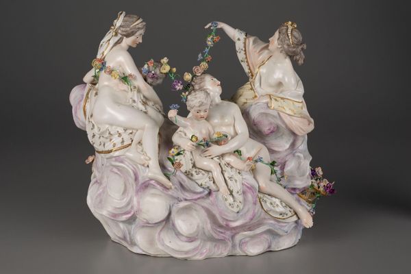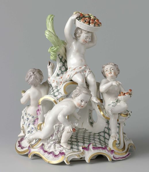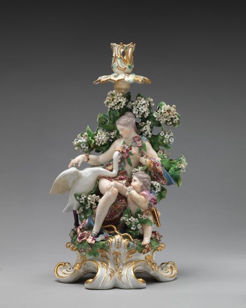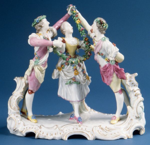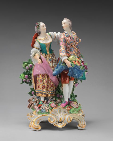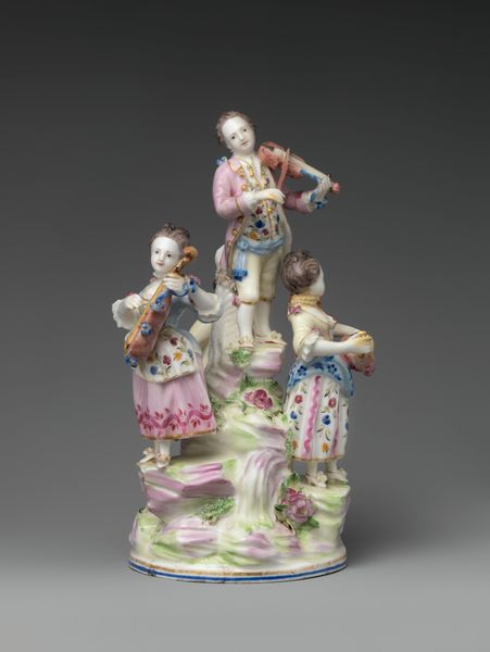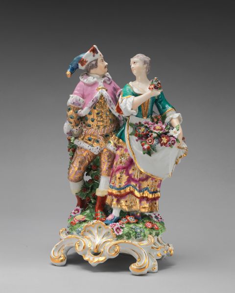 Editor: Here we have "Lovers and Jester," crafted around 1765 by the Derby Porcelain Manufactory. It’s porcelain, so delicate. I’m immediately drawn to the intricate details and the playful scene. What story do you read in the crafting and the making of it? Curator: Consider the Rococo era, with its love for ornamentation and extravagance. Porcelain was an expensive commodity, made through laborious and alchemical processes. "Lovers and Jester" reflects aristocratic society; a porcelain imitation, crafted to imitate the affectations of courtly love for domestic consumption. The piece isn't so much about depth as surface. What can this level of decorative and material precision tell us about its audience and intended market? Editor: That's interesting. So, it’s not necessarily about romantic depth, but more about showing off refinement through a material like porcelain, acquired through specialized skills and trades. Curator: Precisely! Think about the labor invested in mining the clay, processing it, the division of labor to craft such delicate adornments and details, and then the distribution through burgeoning trade networks. This scene of frivolity masks an underlying industrial effort. Even the delicate floral patterns—were these painted freehand or through a transfer process? This small change changes how we see the labor and product and it adds value. Editor: Wow, I never thought about it that way. The artwork itself becomes less about the "love" and more about this wider industry that involved multiple areas. Curator: Absolutely. And understanding that industry, the materiality of porcelain, gives us a clearer lens through which to view the social aspirations and consumption patterns of the elite during that era. The sculpture itself is a symptom. Editor: I will never look at decorative arts the same way. I now have the desire to inspect closely not only what has been represented, but also the methods of production involved in creating the piece. Curator: That is the key to really seeing.