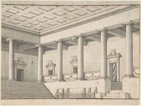 Editor: So, here we have "Fireworks for a Naval Victory," made between 1795 and 1805 by an anonymous artist. It’s a drawing made with pencil, ink, and print. There’s a strange quietness to this supposed firework display; the muted tones make it feel almost dreamlike. What stands out to you in this piece? Curator: The neoclassical architecture dominates. Observe the calculated symmetry, the repetition of forms, and the prominence of the temple facade. The architecture tells a story of power, evoking Imperial Rome, yet made temporal, ephemeral, by the promise of the fireworks. Consider how the artist connects cultural memory to fleeting celebration. What do you think they were trying to communicate through these symbolic connections? Editor: I see it! So it's linking present celebration to a grand, powerful past through these images? Curator: Precisely! The naval imagery—the anchors, the implied power—speaks to a very specific victory, but it's elevated, classicized, through the architecture and allegorical figures. The fireworks, then, become more than just spectacle. They are ritual, the symbolic burning of thanks, loss, remembrance… even perhaps a warning against hubris? Do you notice any other subtle visual cues that contribute to this layered meaning? Editor: Well, the symmetry makes it feel very balanced and controlled, but those almost ghostly fireworks suggest something less defined... a release, maybe? I hadn't thought about loss before, but the fleeting fireworks do bring a bittersweet aspect. Curator: The visual symbols invite multiple interpretations; cultural memory is, after all, subjective and fluid. The image itself becomes a vessel for collective and individual experiences. It gives a glimpse into the past while also sparking reflections in our present. Editor: That makes a lot of sense. I'll definitely be looking at other artwork for their hidden, symbolic languages. Curator: Indeed, every brushstroke, every form, has a tale to tell, bridging eras and echoing cultural through-lines.