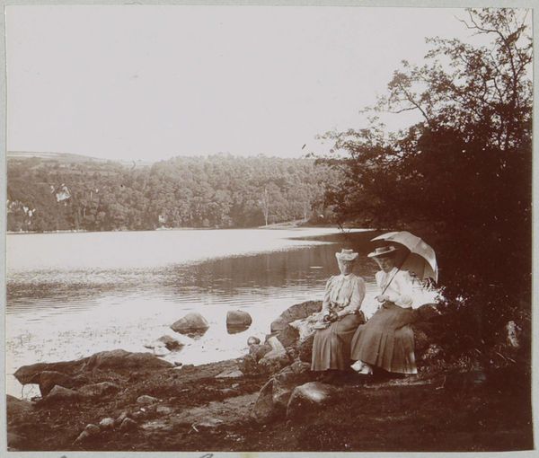 This photograph, 'Vrouw bij het Lac du Bouchet in de Auvergne,' was created by Delizy using early photographic processes involving light-sensitive materials and chemical development. The sepia tones are a direct result of the materials used, imbuing the scene with a sense of nostalgia and distance. This was a time when photography was a relatively new medium. The focus was on capturing reality with accuracy, but the process itself was labor-intensive, involving careful preparation and handling of materials. The presence of figures in the landscape prompts us to consider the social context of leisure and tourism in the 19th century. This type of picture, made via camera, involved specific techniques and equipment. Unlike painting or sculpture, which required individual artistic skill, it relied on industrial production of photographic materials and the scientific understanding of chemical processes. Understanding the material processes behind this image allows us to appreciate it not just as a representation of a scene, but as a product of its time. It reflects the evolving relationship between art, technology, and social practices.