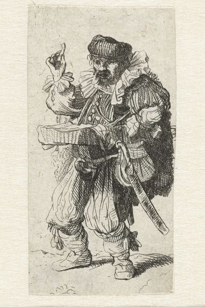 Editor: Here we have Rembrandt van Rijn’s etching, "The Quacksalver," created in 1635. The crisp lines forming this figure really give a sense of character; it's almost theatrical. What do you see when you look at the work? Curator: Formally, the success of this print resides in its delicate, yet forceful use of line. Notice how the density of hatching creates depth, almost mimicking chiaroscuro within the confines of etching. Do you see how the varied line weights add dimensionality? Editor: Yes, absolutely! Especially in the figure’s clothing; you can really feel the fabric. Is the lightness also strategically considered? Curator: Precisely. The open areas serve as a foil to the heavily worked sections, enhancing the three-dimensionality. Consider also how Rembrandt has placed the signature at the lower-left, subtly yet undeniably anchoring the composition. How does that placement influence your perception? Editor: It balances it, keeping the figure grounded, even with that hand raised up high! Curator: Exactly. It redirects the eye, preventing the upward gesture from unbalancing the visual field. We can observe in "The Quacksalver" how Rembrandt is exploring how compositional strategies guide viewers. Editor: I hadn't thought about it like that before – seeing it as less about subject and more about the visual components themselves. Thanks! Curator: My pleasure. Attending to such aspects reveals a more nuanced reading, stripping the image to its basic structural elements and exposing a complex understanding of semiotics.