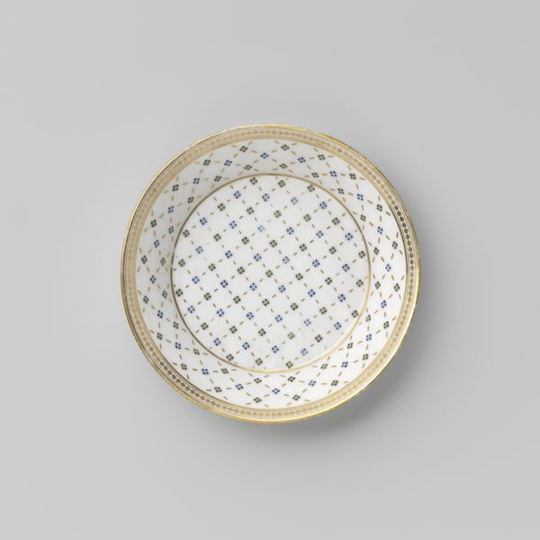 Curator: Immediately striking! Its simplicity draws you in; it feels almost austere yet subtly inviting at the same time. Editor: Here we have a ceramic earthenware plate crafted between 1900 and 1925, its proper title is "Gebakschotel versierd met blokmotief en stippen in geel en zwart"—or, a pastry plate decorated with block patterns and dots in yellow and black, made by Chris van der Hoef. Curator: It’s clearly decorative, beyond purely functional, although you could serve pastries on it. It’s hinting at class, perhaps the bourgeois ritual of afternoon tea… And the geometric pattern appeals to my understanding of a burgeoning visual and social dynamic! Editor: Absolutely. Consider the production process. The standardization implied by geometric patterns highlights an interest in industrialized methods, potentially even mass production within a changing socio-economic landscape of the Netherlands. Earthenware made accessible artistry to a broader public! Curator: This intersection becomes interesting when we consider women's domestic labor during this time. Who was setting this table? Were they afforded any other spaces for self-expression or were their identities inherently confined to these spaces of labour and how might this decorative plate complicate such narratives? Editor: Good questions. The yellow and black also provide interesting material cues, pigments requiring skilled application—likely indicating a separation of design and creation processes. Its aesthetic is also speaking to consumption; what kind of household invested in stylized tableware? It opens inquiry to class and wealth as they influence artistic expression. Curator: Agreed, and these block motifs become coded markers of identity and aspiration. Were they appropriating other cultures as was very common in western societies at the time and therefore performing a social currency of worldly knowledge? Or a nascent awareness of global aesthetics entering Dutch homes and impacting notions of good taste, so it becomes more than merely an art object. Editor: Indeed, the choice of design, even something this simple, becomes intertwined with ideas about value and meaning! It really does provoke us to think of design not just in formal but social, industrial and individual contexts! Curator: So we witness not simply a plate, but a charged site— a meeting ground of domestic performance, identity, and historical forces. Thank you, this ceramic witness opens doors to broader and more critical questions than it seems capable of holding! Editor: An ordinary thing which offers insights into the complex machinery that produced the object and produced society around it! A rich tableau.