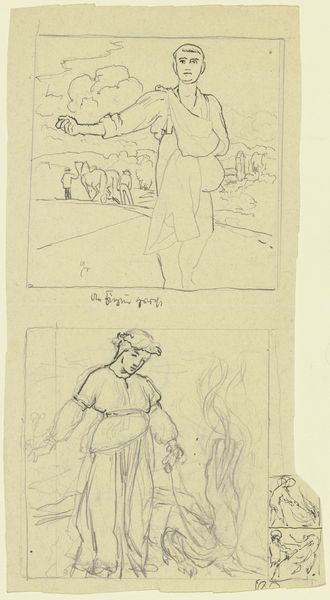 Editor: This is "Studieblad met twee vrouwen met kruiken op het hoofd, een man op een ezel en een vrouw die vogels loslaat bij een veulen," a pen and ink drawing by Leo Gestel, created sometime between 1891 and 1941. It feels like looking at a page from a fantastical sketchbook. All these different vignettes… what’s your read on this piece? Curator: Oh, this speaks of artistic wandering! It's like catching Gestel in a moment of pure, unbridled ideation. I’m immediately drawn to the way he juxtaposes the everyday with the almost mythical. Two women carrying water, a man on a donkey, and then – poof – a woman releasing birds to a foal! There's a delightful dance between observation and invention here. The seemingly random placement of motifs, some even upside down, gives the feeling of a dream. Do you find yourself drawn more to one of these scenarios in particular? Editor: I like the lower one; the woman freeing the birds feels really symbolic and optimistic. Is that a modernist trait to create that sort of personal symbolism? Curator: Precisely! Modernism embraced personal symbolism with gusto, seeing the artist as a kind of lone voyager, charting inner territories. In releasing those birds, is she releasing her own creative spirit, maybe? Perhaps setting free traditional constraints to frolic with a fresh new foal. We can but wonder, can't we? It makes you consider Gestel's state of mind, doesn't it? Editor: Definitely! I'm now seeing the drawing as much more than just a study. It feels like a window into Gestel’s imagination. Curator: Exactly. Art isn't always about grand pronouncements. Sometimes it’s in these smaller, intimate sketches that we find an artist’s truest voice. The uninhibitedness feels… liberating! Editor: I completely agree. Looking at it this way really opens it up. Curator: To truly understand the work you really need to imagine the artist working in his own space, time and emotions. Art offers that portal.