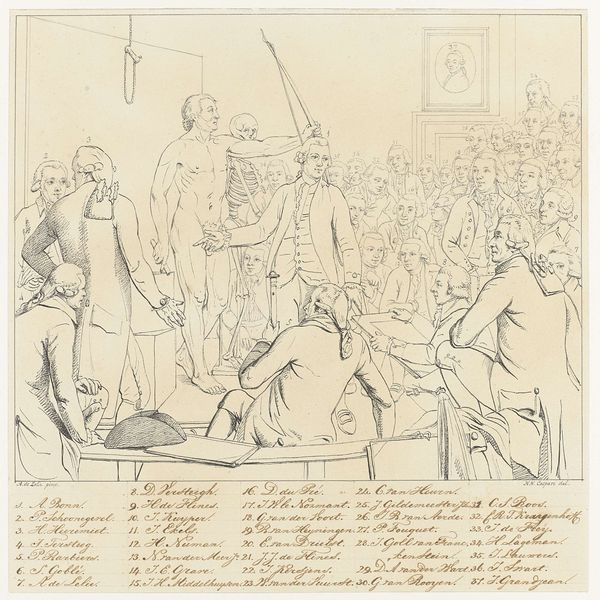 Daniel Nikolaus Chodowiecki, a Berlin-based artist, created this pen and gray ink drawing titled "Omtrekken van koppen met legenda," which translates to "Outlines of heads with captions." It’s a study of twenty-three men who look to be of noble birth, all depicted with powdered wigs, many with ornate jackets and military garb. Without knowing each man’s individual history, the portrait becomes a record of powerful white men who were active during the Enlightenment. Each figure is labeled and listed below. Chodowiecki himself lived through the Enlightenment and was very interested in the scientific pursuit of truth. He was a member of the Berlin Academy of Arts and Sciences and a keen observer of the cultural shifts in Europe, which is felt in the precision of his studies. While at first glance, this portrait of men appears benign, the lack of representation of other identities invites us to consider how power is expressed through art, and how portraiture has historically been reserved for those in positions of privilege.