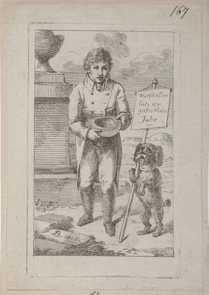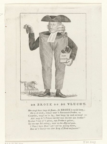 This etching presents William Hogarth, rendered by an anonymous hand, likely as satire. Observe the bag labelled "Royal Oak and Ana," referring to a fund. It is grasped by a shadowy figure, symbolizing hidden influence. The bag as a symbol of concealed forces has a long lineage. We see it echoed in Renaissance depictions of Fortune, or even earlier, in ancient Greek images of Hermes carrying a purse, representing commerce and cunning. Here, the bulging bag suggests corruption, subtly undermining the image of Hogarth. Psychoanalytically, this might tap into anxieties about transparency and integrity, recurring themes in societies grappling with power. Note the artist's palette hanging from Hogarth's neck like a yoke, symbolizing his profession but also the burdens of public life. The artist's dog, often a symbol of fidelity, looks on passively. The motifs cycle, resurfacing in contemporary debates about ethics and political maneuvering. The emotional power lies in its unsettling insinuation, leaving us to question what truly lies beneath the surface of appearances.