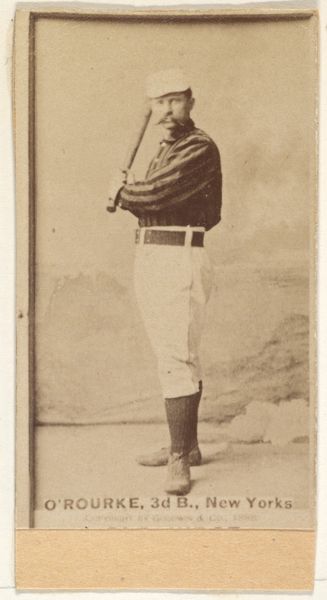 Curator: Looking at this piece, it seems imbued with such stillness, almost a melancholic air. Editor: Yes, Goodwin & Company created this photograph, dating from 1888. It's part of the "Old Judge" series of baseball cards, designed to promote their brand of cigarettes. The image shows Rehse, a pitcher for Minneapolis. These cards functioned as both collectibles and advertisements. Curator: I see a kind of youthful resolve, an unformed determination reflected in his eyes. Even though it's just a sepia-toned portrait, he emanates the spirit of that nascent American pastime and embodies what would become popular visual language. Baseball represents not just athleticism but a deeper cultural identity forming through images that capture these heroic-like figures. Editor: Exactly. These baseball cards weren't just portraits; they contributed to building a culture of celebrity around these athletes. Note how “Old Judge Cigarettes” is boldly advertised below Rehse. Smoking and baseball were interwoven. This simple image demonstrates the commercialization of sports figures and the way brands embedded themselves within popular culture, aiming to capture market share. It also reveals the institutional power of marketing at this early time in US History. Curator: But there's more than advertisement at play. Look at the way Rehse holds his baseball bat, almost reverentially. Think of ancient icons, carefully preserved across eras – a comparable dedication given to the act of play, symbolizing broader ideals, like skill or leadership, mirrored even through a baseball bat and the athlete representing collective ambition. Editor: Certainly. It illustrates how baseball rapidly became a national symbol, particularly significant amid the ongoing transformations of American society, as baseball rose as a popular unifying factor that still continues. Curator: And beyond cultural value, images hold symbolic weight within communities. Baseball represents competition, ambition, and collective spirit, capturing a period in history. It encapsulates how sport became a form of expression that reflects deeper yearnings for unity amid broader divisions and anxieties of an evolving nation. Editor: In seeing the connection between celebrity, marketing, and culture embedded within this "Old Judge Cigarettes" baseball card, we have learned how baseball was not just a game, but how it shaped an essential component of collective American cultural identity. Curator: It is a simple image, yet complex with historical weight – a glimpse into a bygone era and also enduring ideals.