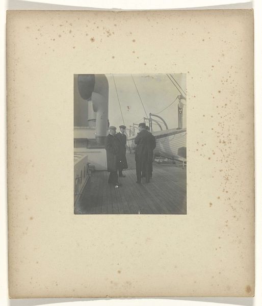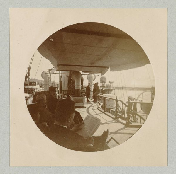 This sepia photograph, titled "Opvarenden op het het dek van de Hohenzollern," was taken by Paul Güssfeldt. The image captures passengers relaxing on the deck of the Hohenzollern, likely using the then newly emerging collodion process, a technique that democratized photography. The albumen print would have been created by coating paper with a layer of egg white and then exposing it to light through a negative. Consider the social context: the Hohenzollern was a German imperial yacht. The very act of leisurely photography aboard such a vessel speaks to the burgeoning culture of tourism and leisure among the upper classes. The photograph itself, a relatively accessible medium, also hints at the gradual merging of artistic practice with commercial enterprise. Paying attention to materials, processes, and the cultural context in which it was made expands our understanding of the photograph and its meaning, challenging the traditional distinctions between fine art and craft.