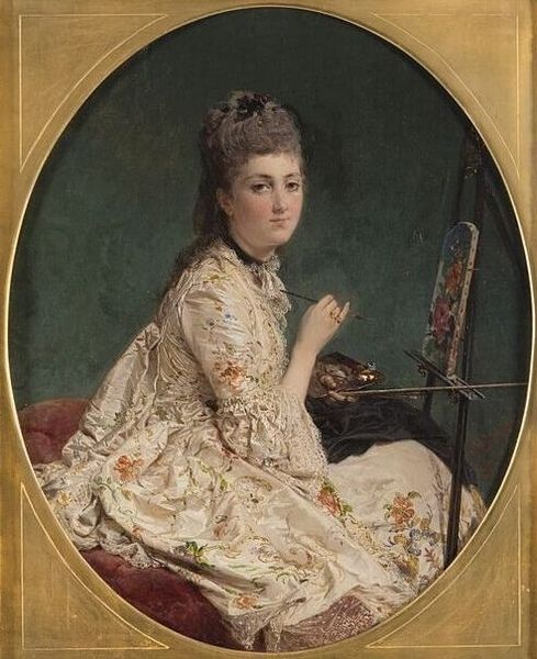 Editor: This is "The Female Painter" from 1871 by Gerolamo Induno. It’s an oil painting, and the way she’s posed with her palette and brush makes it seem like we’ve interrupted her in the middle of creating something. I’m curious about your interpretation. What strikes you most about the formal qualities of this piece? Curator: What I find most compelling is the interplay between light and shadow. Observe how Induno uses chiaroscuro, particularly the way the light catches the fabric of her gown, creating a rich tapestry of textures. Consider, too, how the artist directs our gaze through compositional strategies, from the canvas at left to her own gaze facing toward us. Note the careful composition, contrasting the textured gold of the dress with the dark, neutral background, thereby emphasizing her presence. Editor: It's interesting how you focus on light and shadow, almost disregarding that she is supposedly painting a picture herself. But are there deeper elements you observe, or is it purely about light and color? Curator: One cannot disregard subject matter entirely. But, the semiotics of her clothing--the implied wealth, the high style--are far more critical in understanding the painting's success than her mere act of painting. Are we celebrating women as creators, or gazing upon a desirable object in repose? Editor: That is insightful. I initially thought this was about portraying a female artist, but analyzing it from a purely structural viewpoint gives the work entirely new depths. Curator: Precisely! The formal qualities, you see, are rarely innocent. They structure meaning, consciously or otherwise. I'm so glad to find we have increased your perception and appreciation.