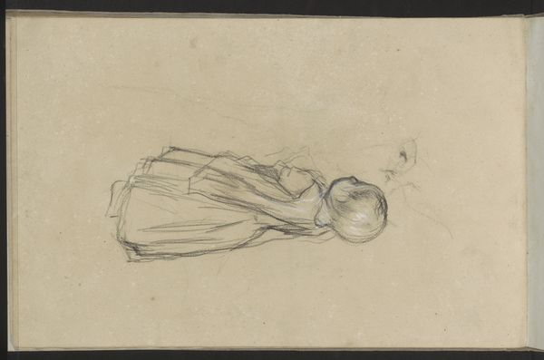 Editor: Here we have "Young Woman with a Bonnet and a Basket on her Arm," a pencil drawing by Johannes Bosboom made sometime between 1827 and 1891. It feels very fleeting and sketch-like. What strikes you about it? Curator: I notice the economy of line above all else. Bosboom masterfully suggests form and texture with minimal strokes. Note how the lines defining the bonnet subtly vary in weight, hinting at its material and the play of light. What do you make of the overall composition? Editor: It's quite simple, almost stark. The figure is centrally placed with not much background detail, drawing all the focus onto her. Curator: Precisely. This compositional choice forces us to confront the figure directly. Observe the geometry; the bonnet's curves echo the shape of the basket, creating a visual rhythm. How do the tonal values contribute to the work’s effect? Editor: They are limited to a narrow range from white to pale gray which makes her seem somehow vulnerable. It seems so much of her is unsaid because it is suggested with line. Curator: The restraint amplifies the power of each deliberate mark. Bosboom seems less interested in capturing a likeness, and more concerned with abstracting form to essential visual elements, and I feel that there are also traces of his thoughts left on the page for the world to ponder as he had. He may be sketching something deeper about the condition of young women at the time, the drudgery of simple errands, that we are perhaps prone to overlooking as unworthy to be included in art. Editor: It is interesting how this detailed attention to simplicity becomes almost its own powerful statement, reflecting his interpretation. This new context and formal elements help give it a strong point of view. Curator: Indeed. Examining the formal devices illuminates his aesthetic intention and, I hope, your perspective. Editor: Thank you, that's incredibly insightful, viewing art as the pure form of material and thought is now more evident to me.