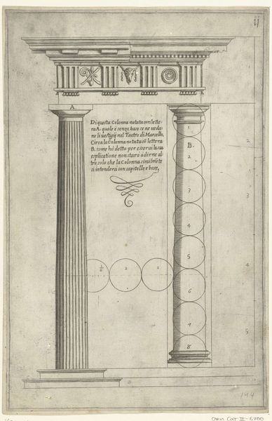 Editor: This engraving from 1636, titled "Two Doric bases, columns, capitals and headgear with details," is by an anonymous artist and resides in the Rijksmuseum. What strikes me is the mathematical precision combined with the artistic details in rendering these architectural elements. How would you approach interpreting this print? Curator: Formally, the engraving presents us with a study in proportions and classical orders. Notice how the artist meticulously employs a grid and numerical notations alongside the drawn columns. It seems almost didactic, doesn’t it? The composition itself reveals a dedication to rational principles. The clean, precise lines are very telling of an academic sensibility. Editor: Yes, it's definitely like a technical drawing, almost divorced from any practical application. Do you think the artist aimed to capture something beyond mere representation? Curator: I suggest the very act of measuring, numbering, and detailing elevates the Doric order. Observe the relationship between line, space, and form and tell me what feelings do the image bring? It strikes me as less evocative of emotion and more aligned with something… instructional. The artist is concerned with accuracy and geometrical clarity, the foundations upon which architectural aesthetics can then proceed. Editor: That makes a lot of sense! I was getting hung up on what it *meant*, but perhaps it's more about the “how”. It almost deconstructs the classical order for the viewer. Curator: Precisely. Focusing on its intrinsic structure rather than external narratives allows for appreciation of architecture's own formal language. And the image makes me wonder, in what ways can such languages, be applied outside the scope of architectural study. Editor: That gives me a completely fresh viewpoint; looking at its structure unlocks more than just the surface level. Curator: I find exploring how the work constitutes itself ultimately allows for an array of interpretations and intellectual pathways that are as valid, if not more, than focusing purely on a cultural context.