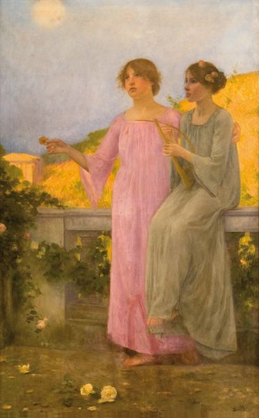 Curator: Alma-Tadema’s ‘Fortune’s Favourite’ depicts a scene of leisure and luxury by the sea, where women admire jewelry on a sun-drenched balcony. The artist's meticulous brushwork really captures the softness of fabric and marble surfaces. Editor: The overriding impression is one of serene artificiality. Everything looks so polished, so consciously arranged, that it almost feels staged rather than truly capturing a moment. Curator: The 'staging', as you call it, reflects a carefully constructed view of antiquity, filtered through a late-Victorian lens. Alma-Tadema drew upon archaeological research but also upon prevailing ideas about class, gender and aesthetics in his own era. How the image reinforced these established concepts through display in both gallery and home becomes significant to consider. Editor: I concede to the way context changes its meaning, yet on purely visual terms, the way Alma-Tadema contrasts the textured marble against the almost ethereal depiction of sea and sky—it creates a striking spatial complexity. Note, too, how the play of light across the figures’ drapery lends the scene its sense of tactile richness. Curator: Considering production, we have a painter steeped in the academic tradition—yet look at the artist's labor within the division of labor as it was in the workshop system during that period. Here's a painting speaking volumes about Victorian aspirations, projecting both a command of history and, importantly, a desire to display access to commodities as markers of social prestige. The labor behind such display also has a story. Editor: Fair enough. Still, looking at it aesthetically, it's difficult to ignore how effectively he has led the eye across the scene. The arrangement isn't arbitrary; the composition encourages us to follow specific movements that are carefully planned. Curator: Exactly. A commodity's journey and a viewer's journey—all guided through social currents that value certain modes of consumption over others. Editor: In terms of colour harmony and textural contrast, 'Fortune's Favourite' certainly offers much to observe and admire in isolation, without even mentioning what lay at the end of its assembly line. Curator: And now we’ve acknowledged its existence and placed the artistry within an ideological framework, we can both look at the material reality within the work and the socio-historical reality around the work.