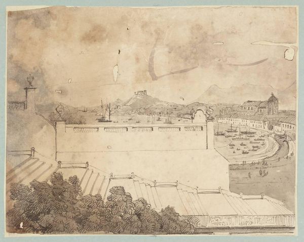 Editor: This is Merry Joseph Blondel's "View of the Battlements of Grottaferrata with Mount Cavo in the Background," a drawing from the 19th century. The stark lines create a rather imposing effect. How would you interpret the social context of such a fortress captured in art? Curator: It's interesting to consider this through the lens of power, isn't it? Blondel, by focusing on military architecture, presents a view of the Roman Campagna steeped in historical and political control. What do you notice about the composition that might reinforce this? Editor: The sheer scale and precise detail definitely evoke a sense of authority and perhaps even inaccessibility. Curator: Precisely. Think about how such imagery might have functioned in the artist's time, shaping perceptions of power and reinforcing the existing social order. It really makes you wonder, doesn't it?