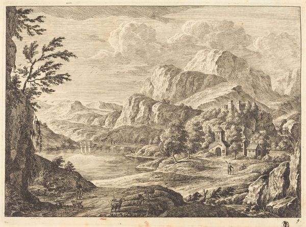 Curator: Here we have an ink wash landscape by Alexander Cozens, dating from the 18th century. Editor: It's incredibly atmospheric. I feel dwarfed by the scale of that mountain, yet strangely comforted by the trees in the foreground. Curator: Cozens was known for his "blot" technique, which involved creating abstract ink blots and then developing them into landscapes. Think of it as a 18th-century Rorschach test. Editor: So, was he inviting viewers to project their own emotional landscapes onto these scenes? I see a subtle critique of Enlightenment ideals, suggesting nature's power over human control. Curator: Perhaps. Landscape at the time was often tied to ideas of property and dominion. Cozens's method, however, seems to relinquish control, leaning into nature's inherent ambiguity. Editor: I think it reflects a growing awareness of the sublime, the awe-inspiring power of nature to evoke feelings that transcend rational thought. A very modern sentiment, really. Curator: Precisely, and it's fascinating to consider how that shaped not only art but also social and political perceptions of the natural world. Editor: It's work like this that reminds us landscape isn't just scenery. It reflects how we understand our place in the world.