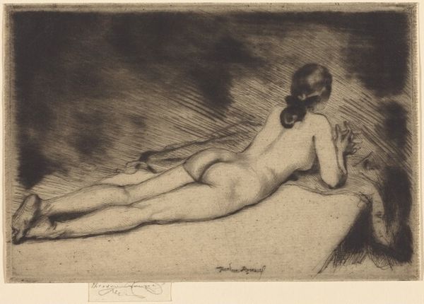 Editor: Theodore Roussel's "Nude Figure Lying Down," created in 1906, a graphite drawing on paper. I'm struck by the intimacy of the scene, almost like a private glimpse into a quiet moment. It seems almost… academic. How do you see it, in its historical context? Curator: That academic feel is key. Consider the art world of 1906. While avant-garde movements like Fauvism were emerging, academic art still held considerable sway, particularly within institutions and among certain audiences. This drawing plays into that established tradition of the female nude, but how does it subvert or engage with expectations around the female gaze and subjecthood, within the conventions of the time? Editor: So, it’s like he's acknowledging the established norms, while perhaps trying something different? What was the cultural understanding of female nudity like back then? Curator: Exactly. Think about the role of the nude in art history – often associated with classical ideals, morality tales, or simply as an object of male pleasure. By the late 19th and early 20th centuries, artists and critics started questioning these traditional roles, even if the challenge wasn’t always explicit. The figure here is presented naturally, in a private moment. How does that presentation impact how it may have been received in comparison to artwork within the salon or academic context? Editor: That makes a lot of sense. I guess I had been considering how it's received today but hadn't taken into account those contextual norms of 1906, and who may have been given access or chosen to consume images of this kind. It definitely gives me a new perspective to think about. Curator: Indeed. It is also necessary to look into the market for prints and drawings versus the art market more broadly. How might the market forces impacted the social meanings this imagery? Editor: Thanks, I am going to delve into it more with that in mind! It’s fascinating to consider how deeply intertwined art is with the society it reflects and shapes. Curator: Absolutely. Seeing art as part of a bigger cultural and institutional system offers invaluable perspectives.